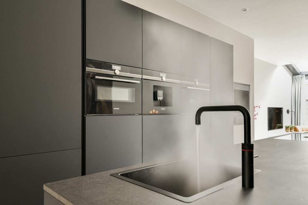 Entree/hal met meterkast (12 groepen), modern betegeld toilet v.v. wandcloset en toegang tot de woonkamer en keuken. Aan de voorzijde bevindt zich de eethoek, waar door de lengte eenvoudig een lange tafel geplaatst kan worden. Onder de vensterbank zijn er vaste kasten. Zowel in de hal als in de eethoek zijn er glas-in-loodramen. Vanuit de eethoek is de in het midden gelegen open keuken toegankelijk. De keuken is werkelijk van alle gemakken voorzien. Zo is er een kook- en spoeleiland met inductiekookplaat met geïntegreerde Bora-afzuiging, een Quooker, een gezellige bar en veel kastruimte. Daarnaast is er een hoge apparatenwand met daarin een koel-vriescombinatie, een combi-oven, een stoomoven en een koffiemachine. Ook in de apparatenwand is er veel kastruimte. Tevens bevinden zich de wasmachine- en drogeraansluiting in de keuken, netjes weggewerkt in één van de kasten. De keuken is afgewerkt met een composiet aanrechtblad. De living ligt aan de achterzijde en kijkt uit op de tuin. De achterkant is vergroot met een glazen uitbouw, wat zorgt voor verrassend veel lichtinval. Tussen de living en woonkamer zorgt een elektrische waterdamphaard voor een gezellige sfeer. Op de gehele begane grond ligt een gietvloer met vloerverwarming en het plafond is afgewerkt met inbouwspots.