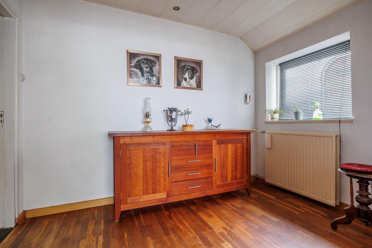 De hoofdwoning biedt o.a. een laminaatvloer en gashaard in de woonkamer, houten kozijnen met op meerdere plaatsen isolerende beglazing en rondom enkele rolluiken. De keuken is modern uitgevoerd met een Siemens keramische kookplaat, wijnklimaatkast, afzuigkap, vaatwasser en veel opbergruimte in laden. De badkamer op de begane grond mag gemoderniseerd worden, een Remeha cv-ketel uit december 2023, vernieuwde meterkast en een na geïsoleerd dak geven een goede basis.