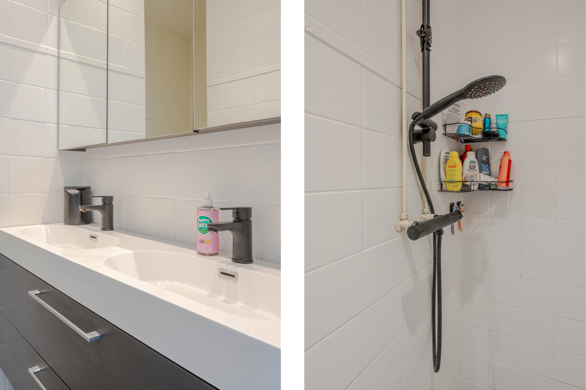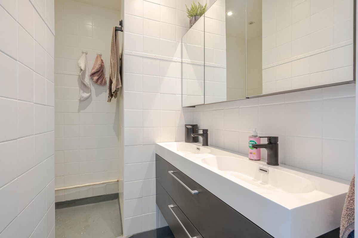 * Badkamer voorzien van inloopdouche, wastafelmeubel, inbouwspots en geheel lichte betegeling.