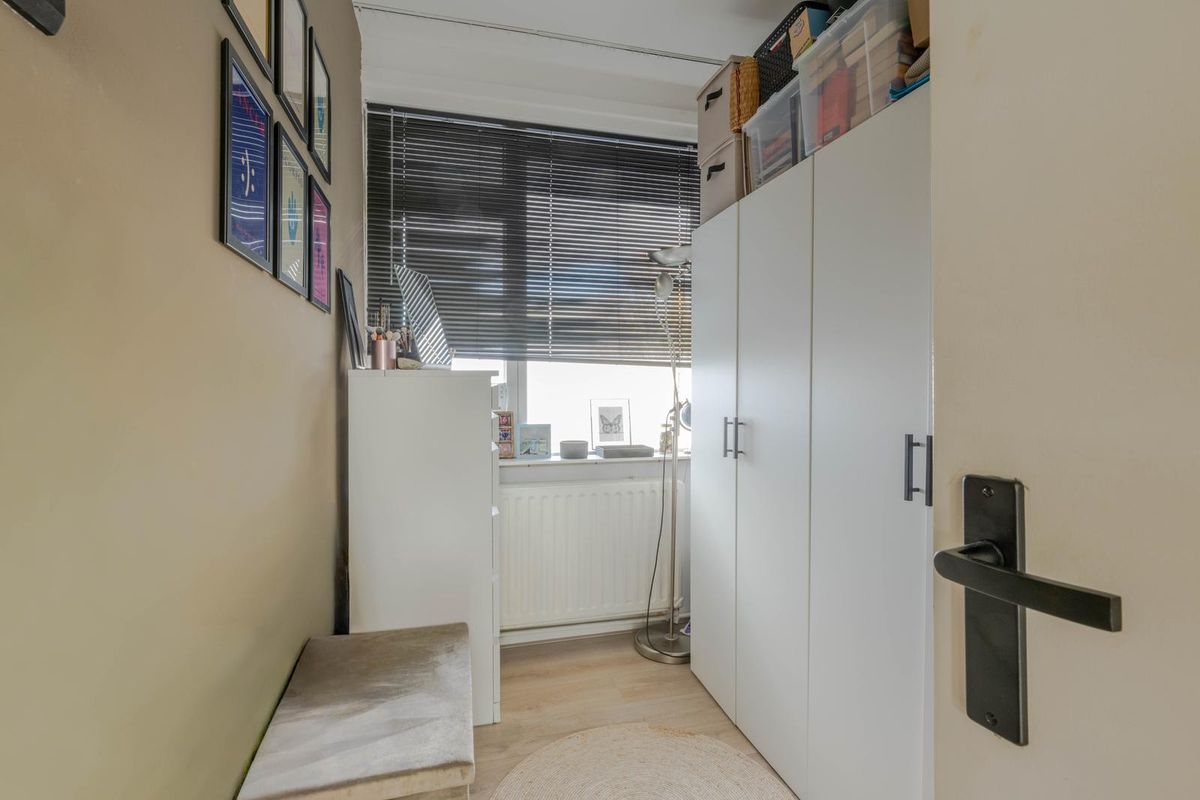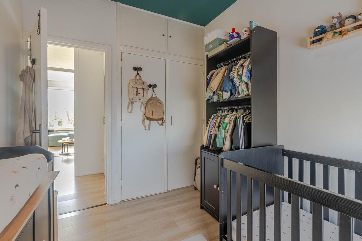 * Slaapkamer I aan de voorzijde voorzien van laminaatvloer, vaste kast met de wasmachine-aansluiting en een deur naar het balkon.