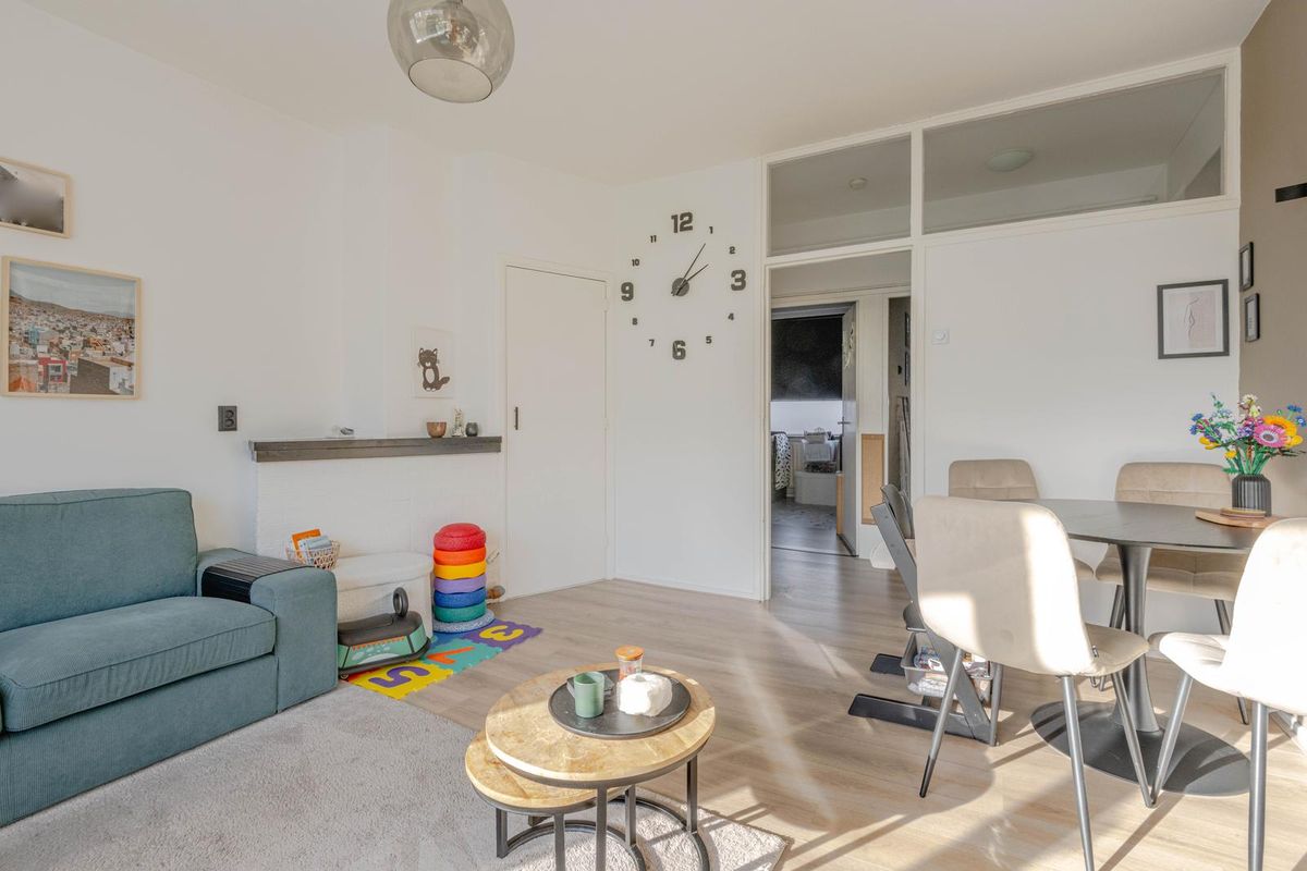 * Woonkamer aan de voorzijde voorzien van laminaatvloer, gestuukte wanden en plafonds en een vaste kast.
