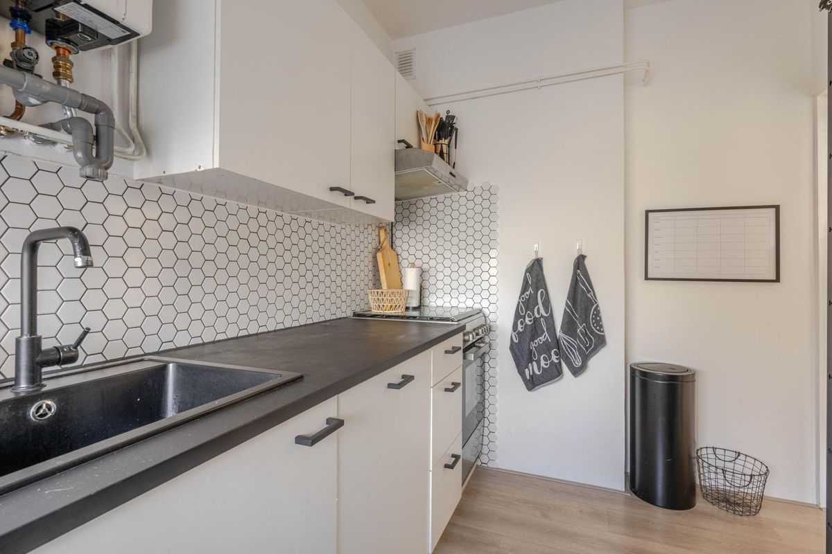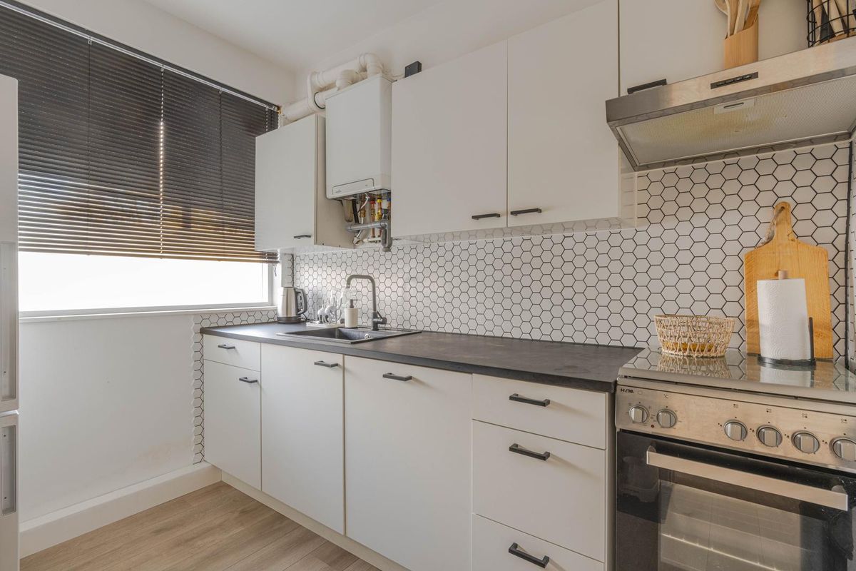 * Keukenruimte voorzien van laminaatvloer, inbouwkeuken met betegelde achterwand en inbouwapparatuur: los gasfornuis met oven, afzuigkap, vaatwasmachine en de opstelling van de C.V.-combiketel.