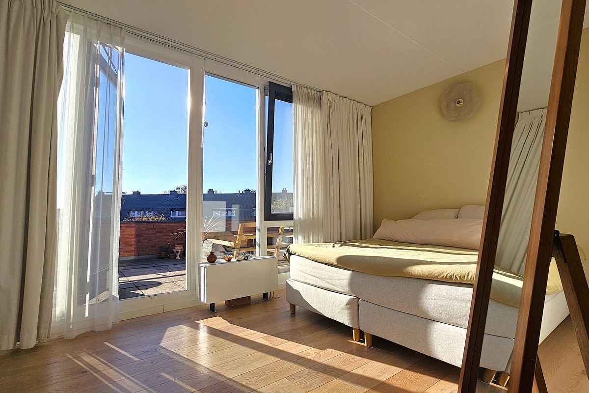 Master bedroom met tweepersoonsbed, royale vaste kastenwand én directe toegang tot het zonnige dakterras.
