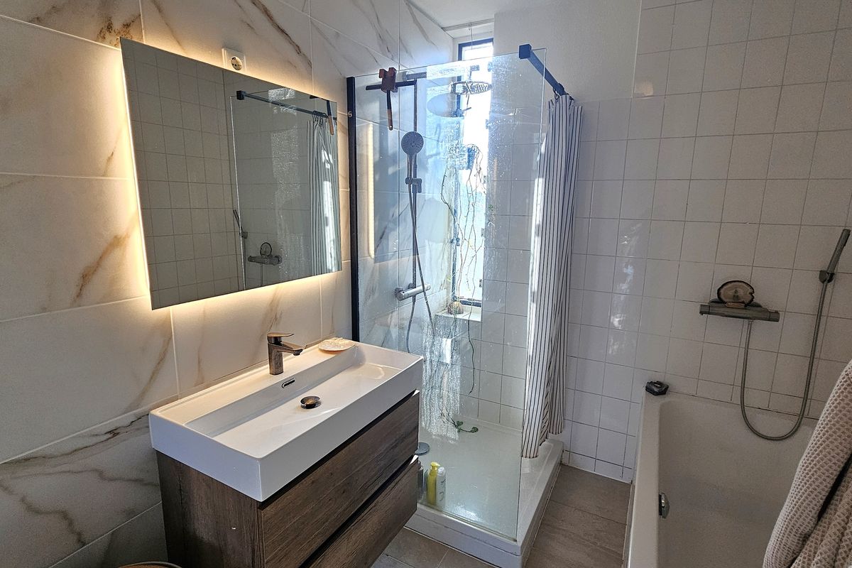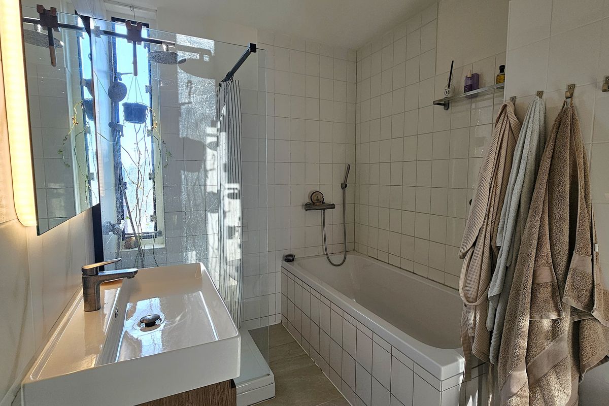 De moderne badkamer beschikt over een inloopdouche, ligbad, wastafel en tweede toilet. Op de overloop bevindt zich een ruime bergkast waarin zowel de wasmachine als de cv-installatie zijn geplaatst.