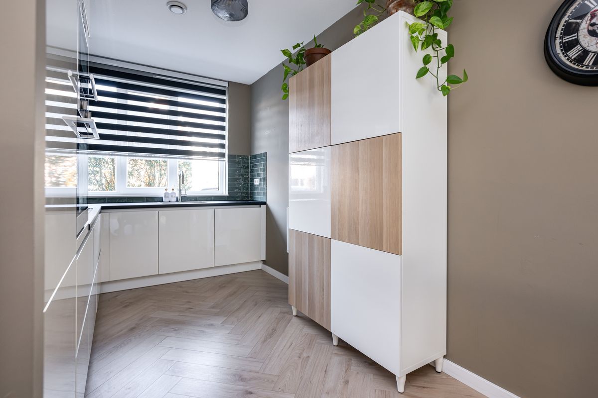 Laminaatvloer v.v. vloerverwarming, 5-pits inductiekookplaat, afzuigkap, enkele spoelbak, Quooker, magnetron, heteluchtoven, vaatwasser, koelkast, vriezer en mechanische afzuiging.