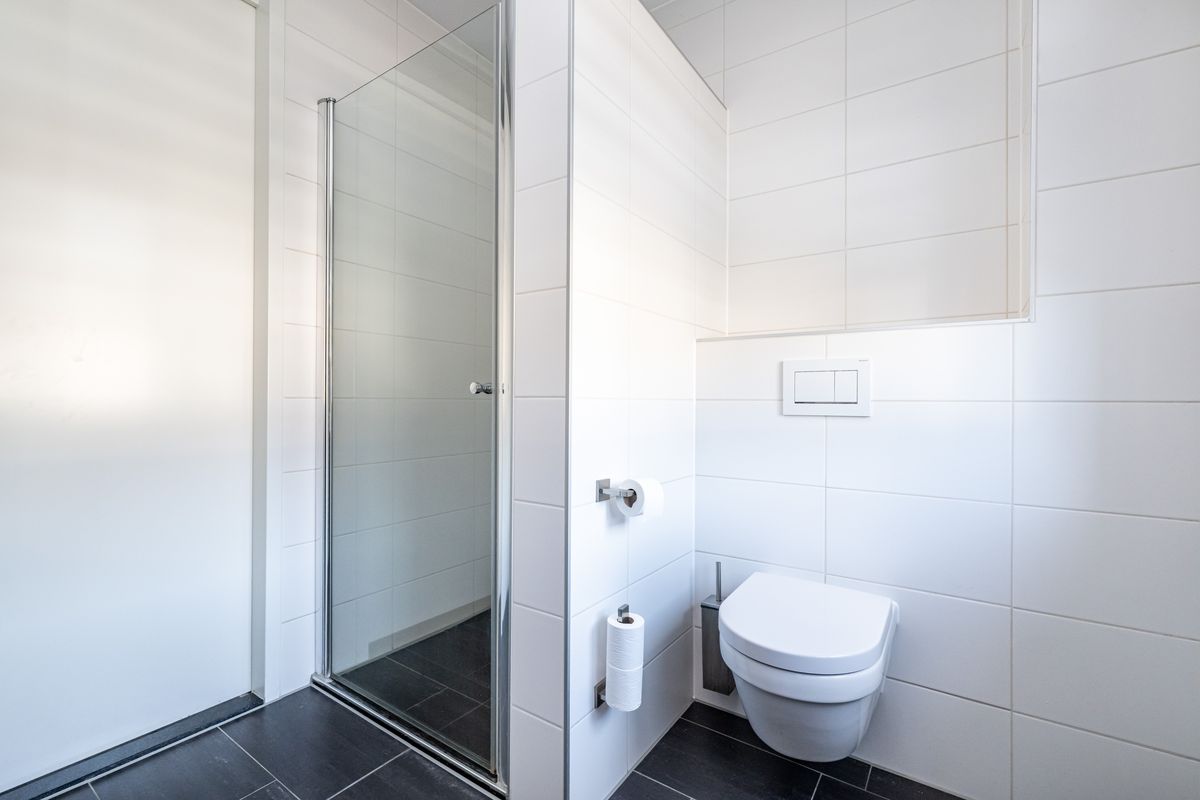 Plavuizenvloer v.v vloerverwarming, zwevend toilet, half betegeld, mechanische afzuiging en fontein.