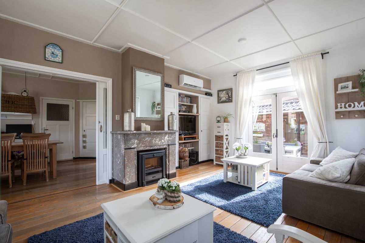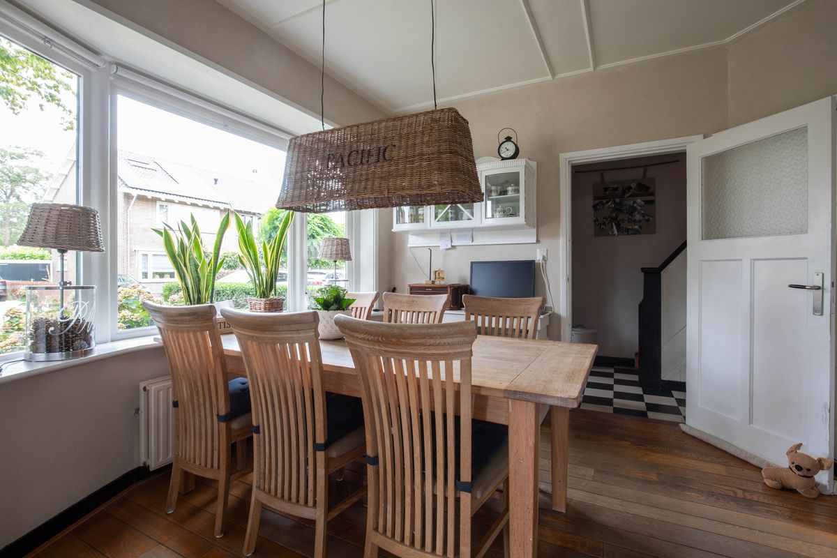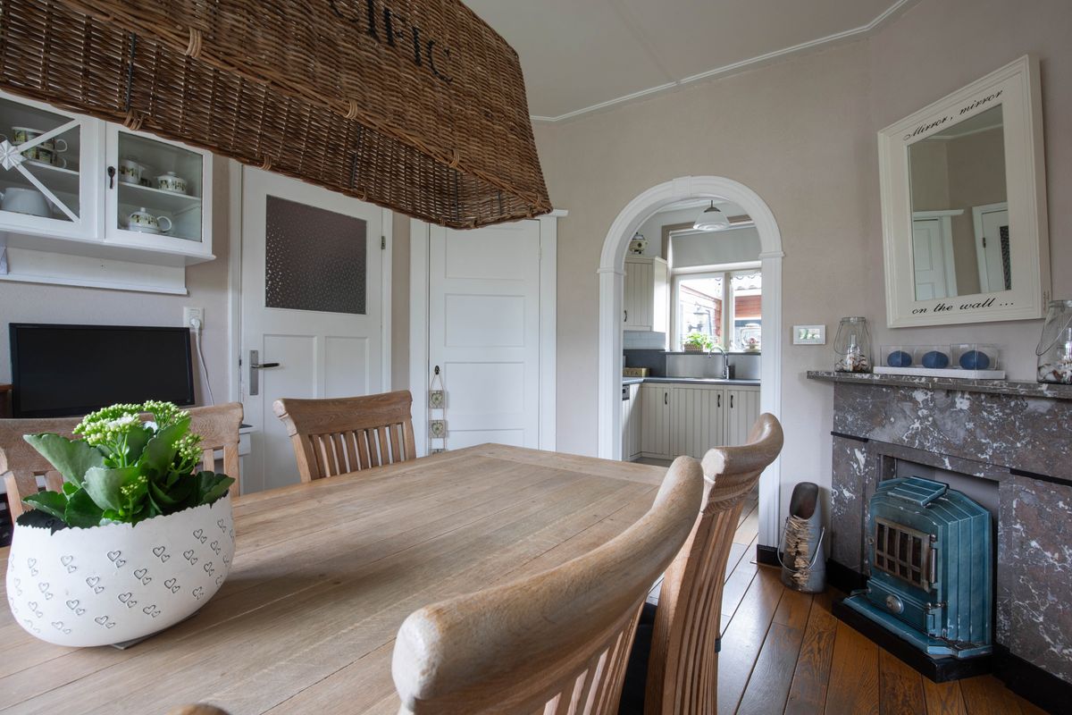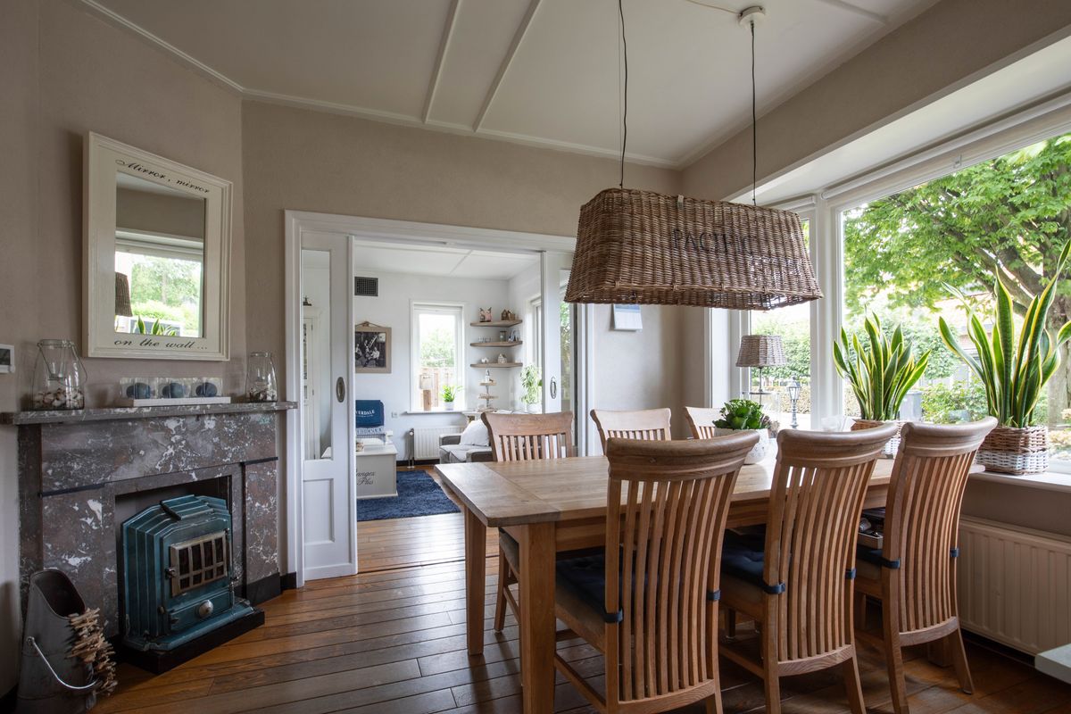 Aan de voorzijde van de woning ligt het gezellige eetgedeelte met een sfeervol erkertje. Vanuit hier is er toegang tot zowel de woonkamer als de keuken. De woonkamer heeft een prettig formaat en profiteert door de hoekligging en de vele raampartijen van een fijne natuurlijke lichtinval. De woonkamer beschikt over openslaande deuren naar de achtertuin. Zowel in het eetgedeelte als in de woonkamer is een sierhaard aanwezig. Daarnaast is de woonkamer voorzien van een airco met verwarmfunctie.