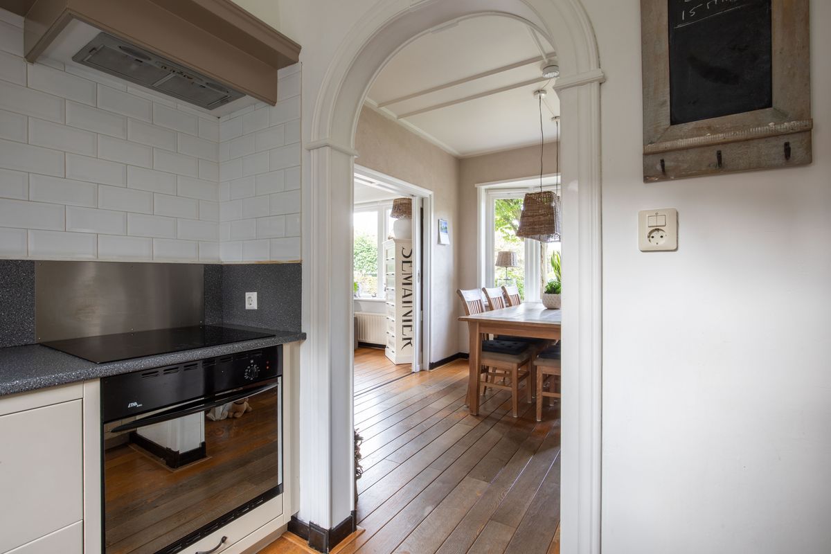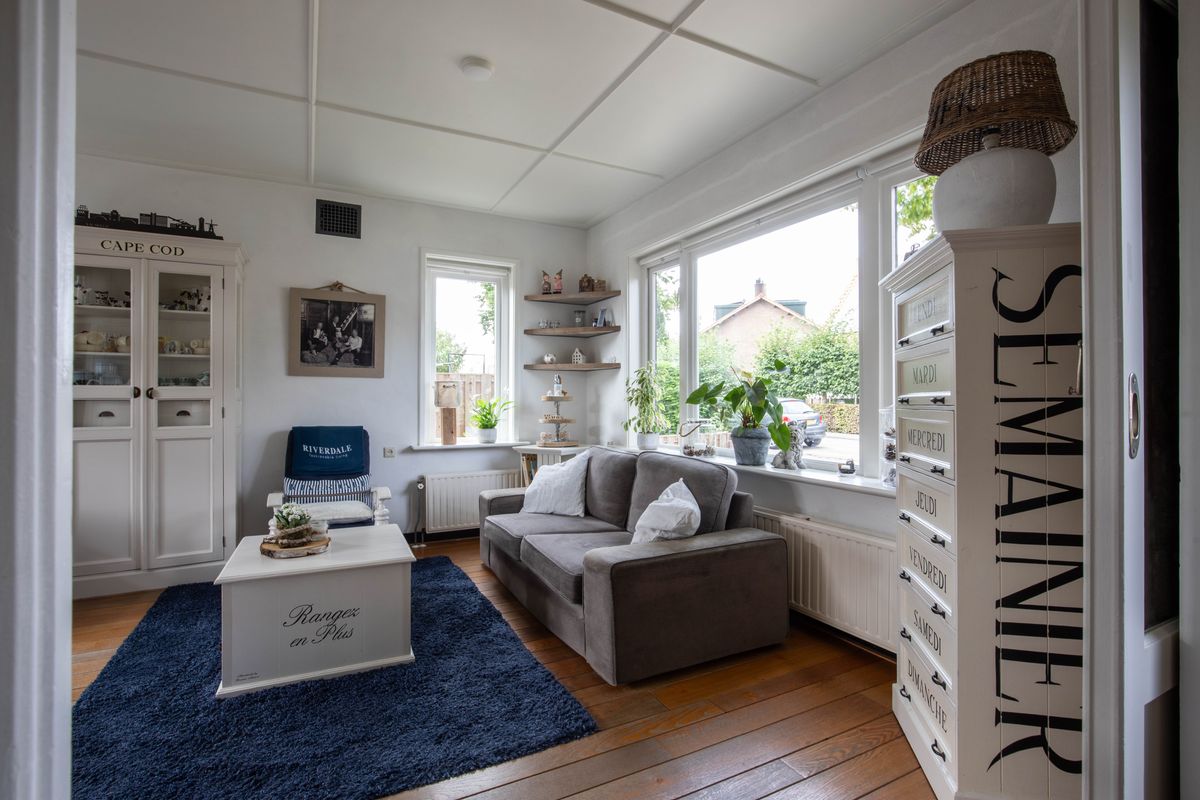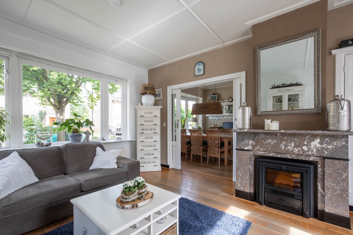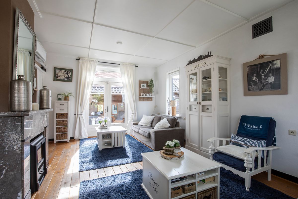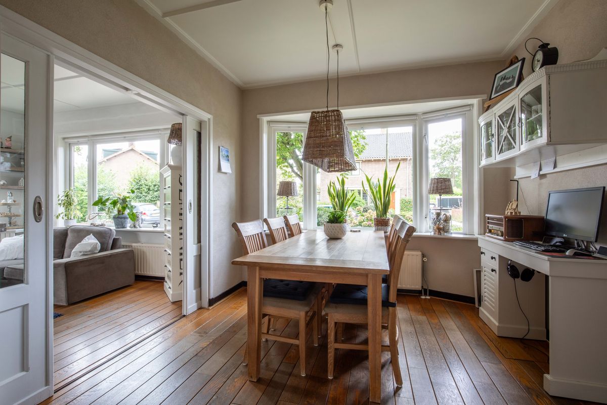 Aan de voorzijde van de woning ligt het gezellige eetgedeelte met een sfeervol erkertje. Vanuit hier is er toegang tot zowel de woonkamer als de keuken. De woonkamer heeft een prettig formaat en profiteert door de hoekligging en de vele raampartijen van een fijne natuurlijke lichtinval. De woonkamer beschikt over openslaande deuren naar de achtertuin. Zowel in het eetgedeelte als in de woonkamer is een sierhaard aanwezig. Daarnaast is de woonkamer voorzien van een airco met verwarmfunctie.