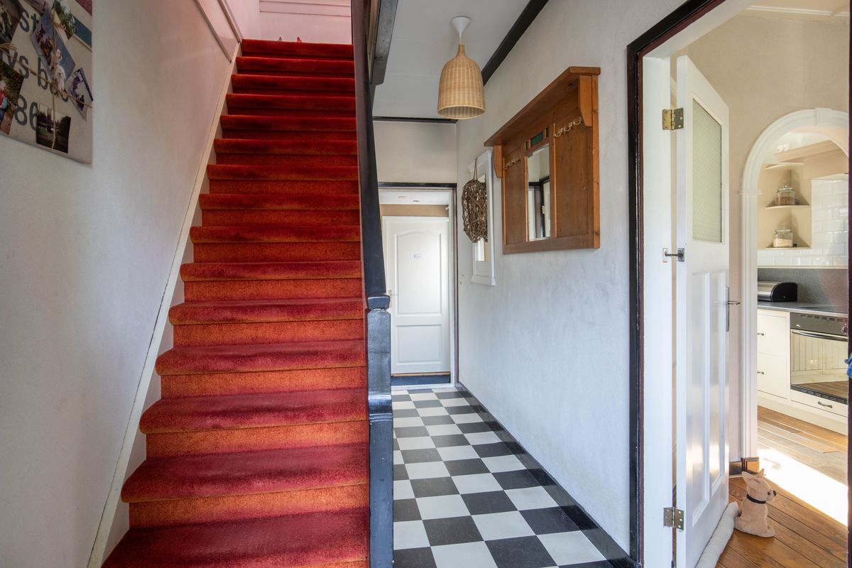 Via de voortuin bereik je de voordeur met toegang tot de hal. Hier bevinden zich het toilet, de meterkast, een kelder-/trapkast, de trap naar de eerste verdieping, een ruimte met de aansluitingen voor wasmachine en droger, toegang tot de badkamer en toegang tot de woonkamer.
