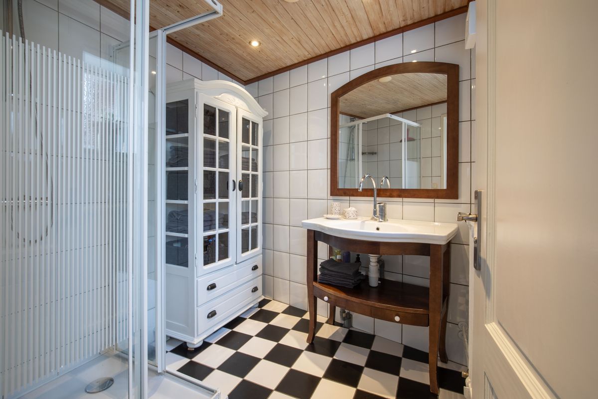 De badkamer is gelegen op de begane grond en is voorzien van een douche en een wastafel