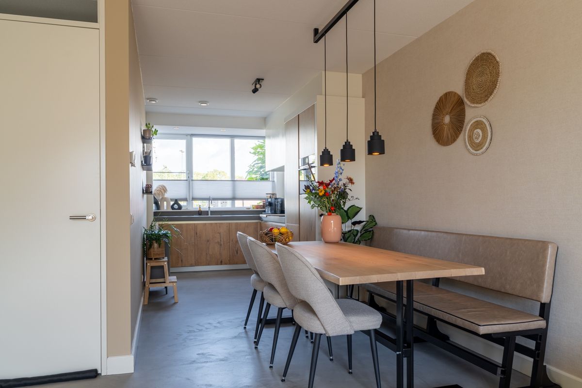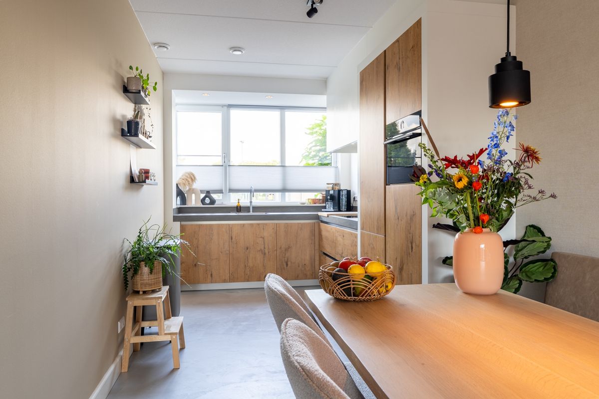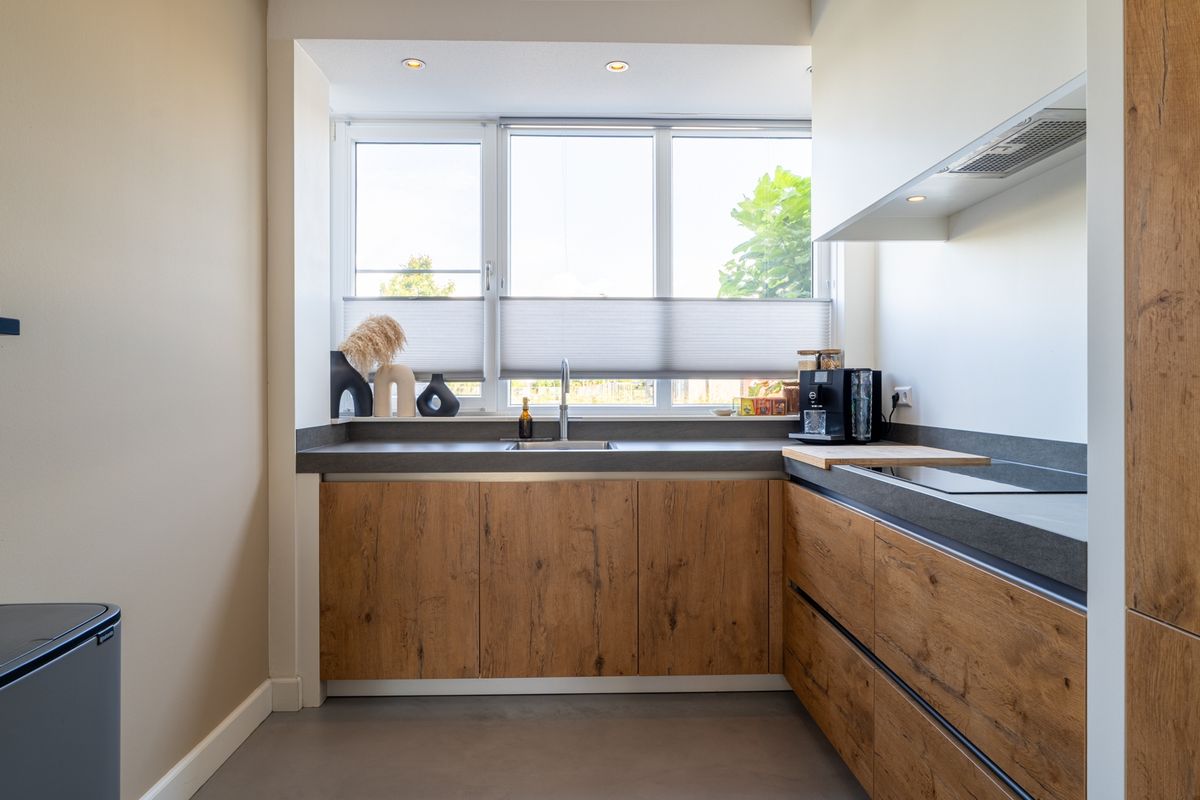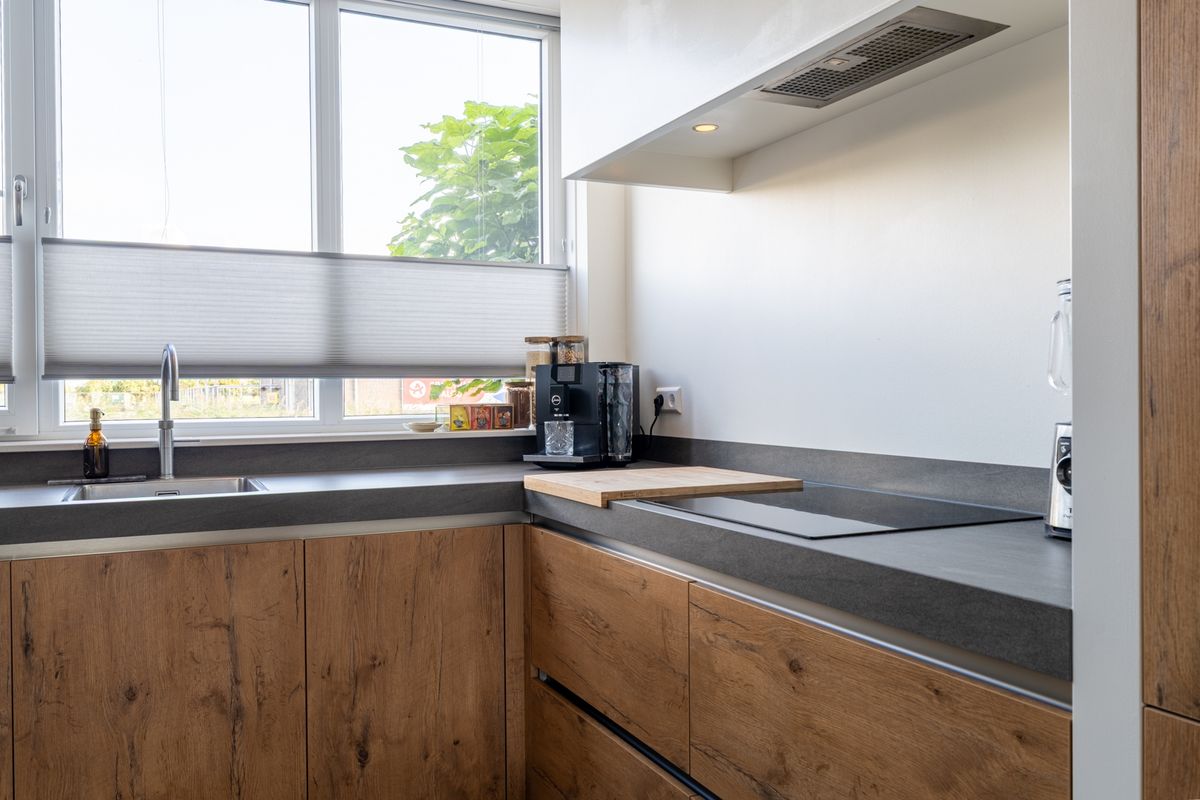 Hier wil je kokkerellen! De keuken is echt een plaatje, met een gezellige erker die zorgt voor extra licht en ruimte. De hoekopstelling is voorzien van alles wat je nodig hebt: inductiekookplaat, afzuigschouw, stoomoven, koelkast, vaatwasser én een Quooker. En dat allemaal strak afgewerkt met een stijlvol stenen werkblad.