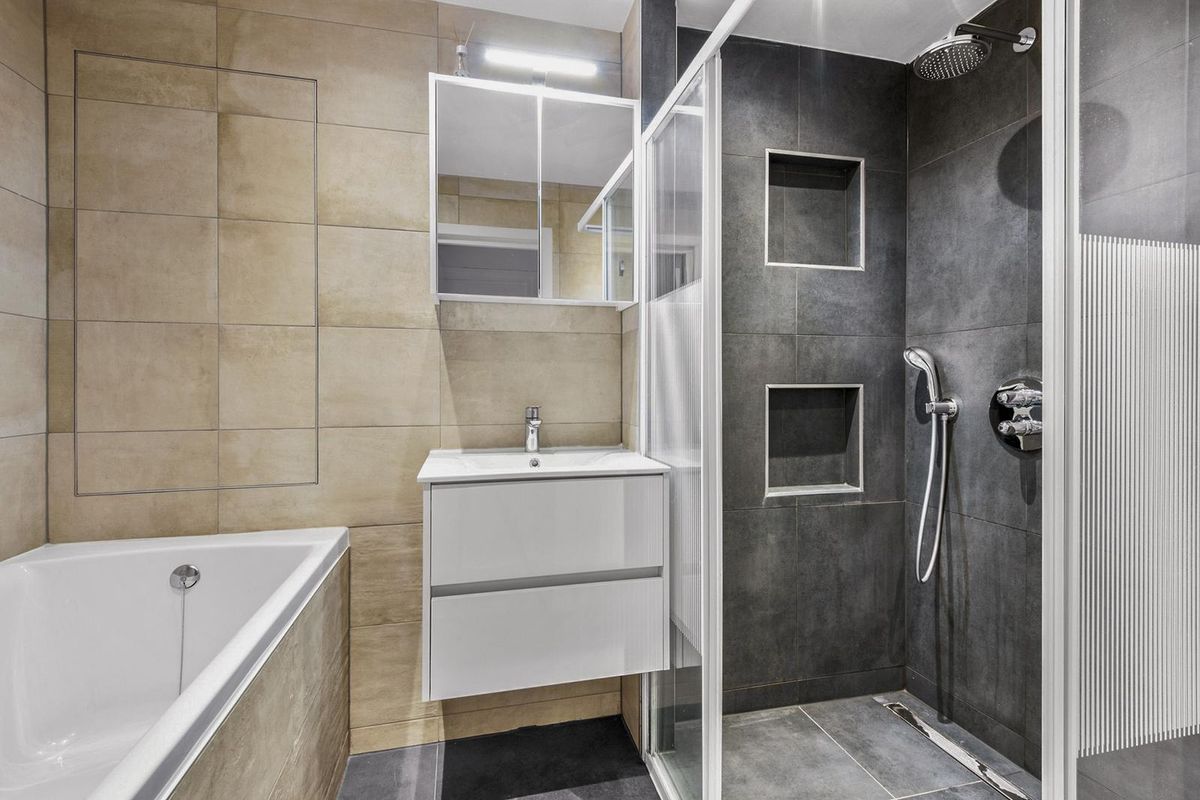 De gerenoveerde badkamer is luxe uitgevoerd en voorzien van zowel een ruim ligbad als een knappe douche, wastafel, spiegel en wederom de nodige opbergruimte. Het toilet is separaat gelegen en voorzien van fonteintje.