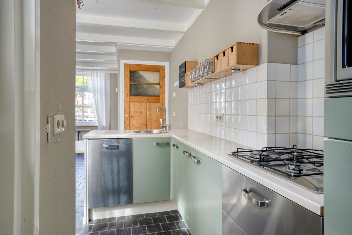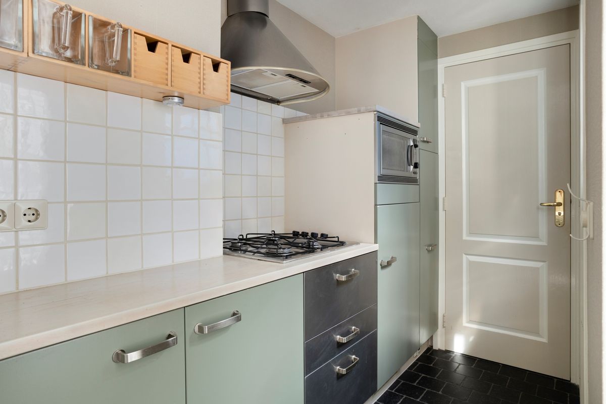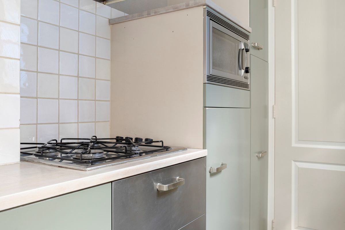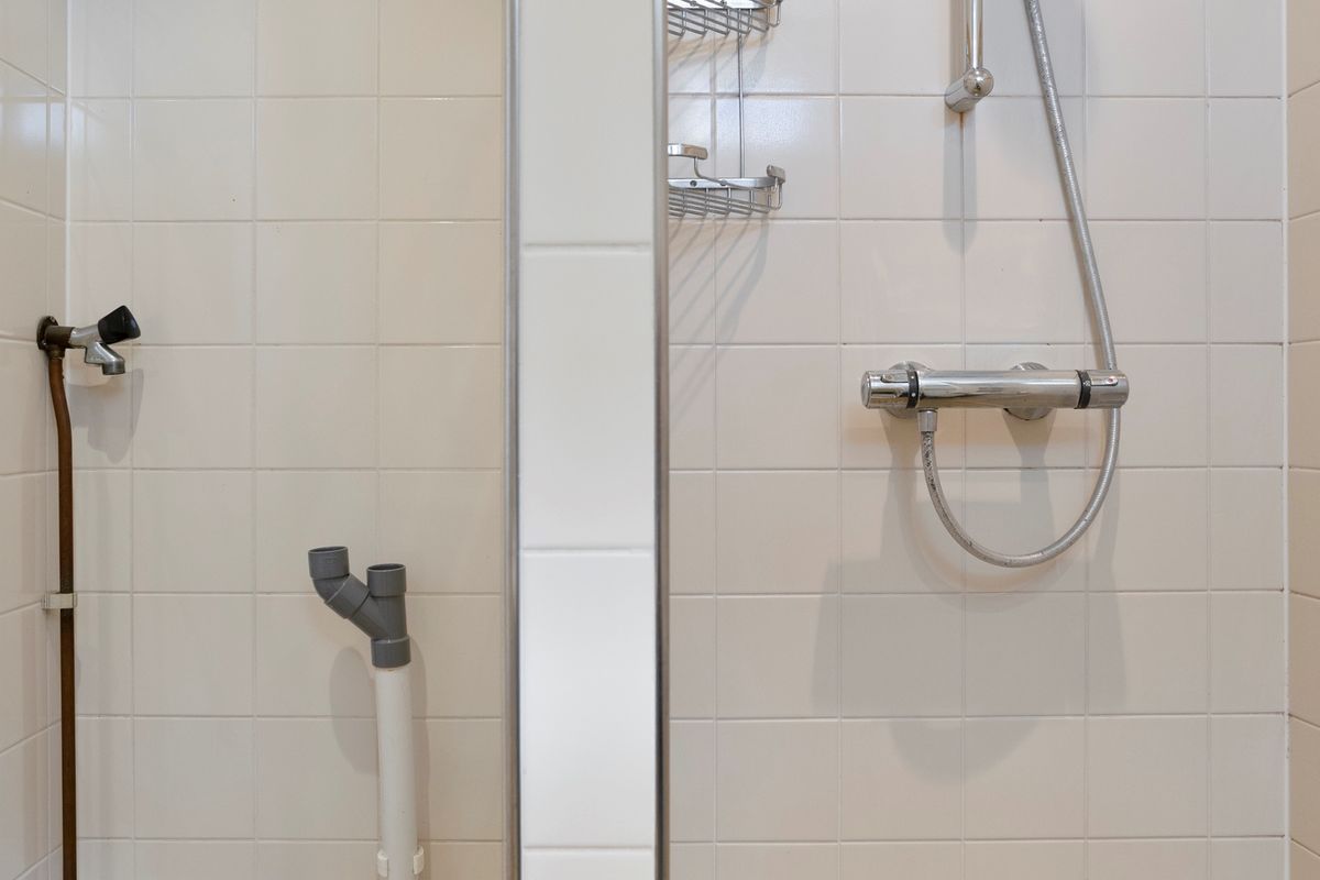 Via de entree kom je direct in de woonkamer, waar het licht volop binnenvalt. De ruimte is slim opgezet en geeft toegang tot de open keuken, voorzien van inbouwapparatuur. Achter de keuken vind je de badkamer, compleet met toilet, wastafel en douche.