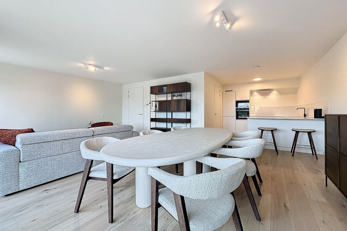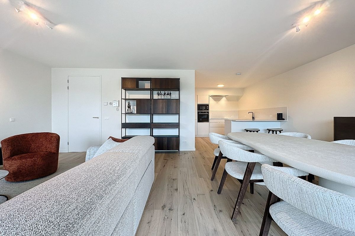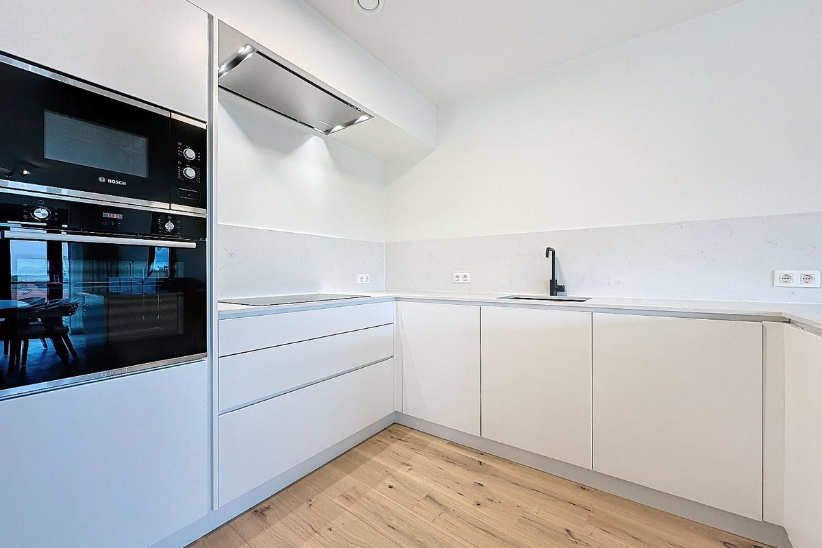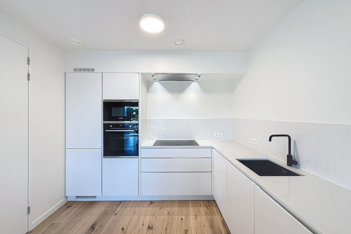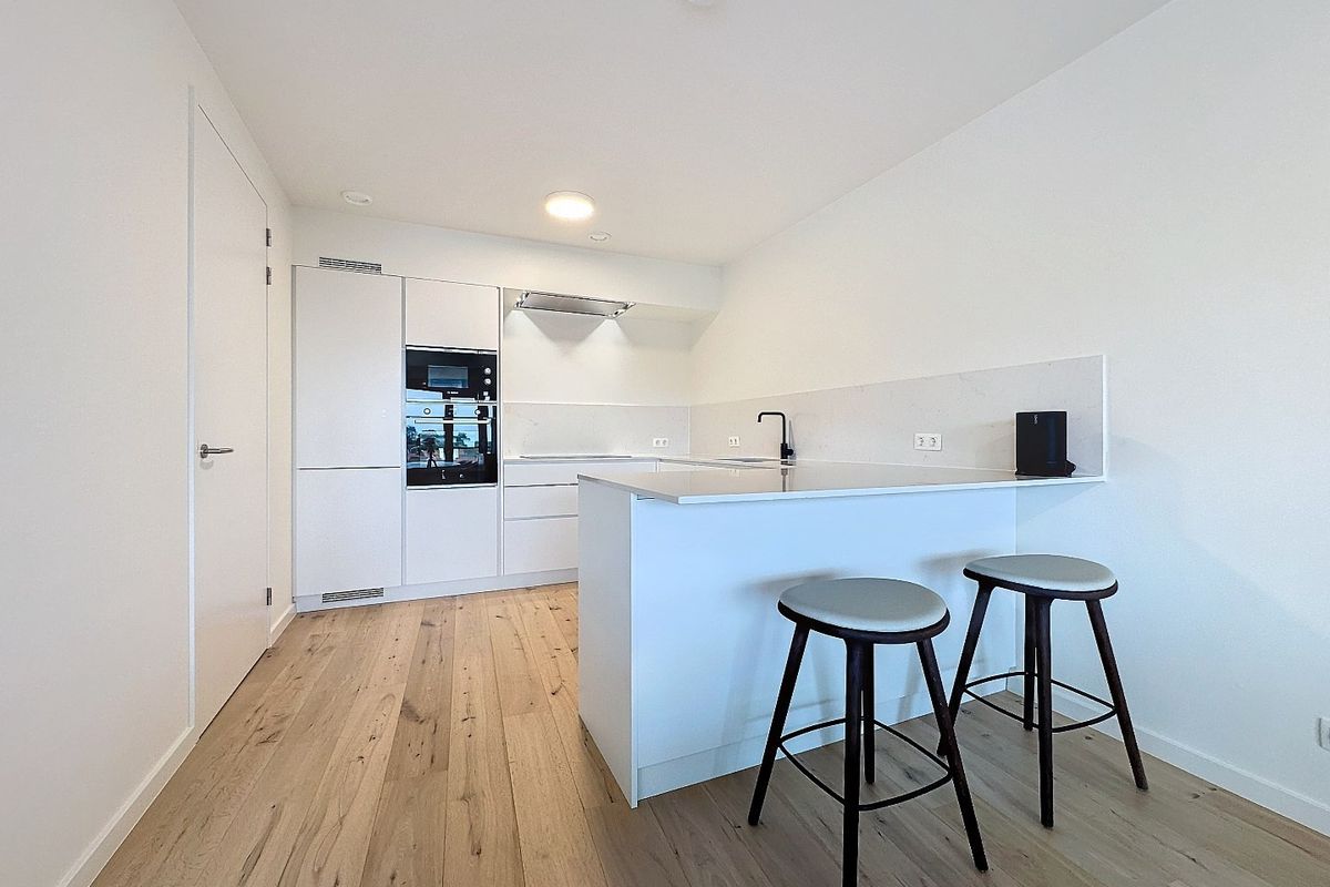 De ruime woonkamer met open keuken van samen circa 53 m² baadt in natuurlijk licht dankzij de grote raampartijen, wat een gezellige en warme sfeer creëert. De vloerverwarming zorgt voor extra comfort. De moderne keuken is uitgerust met hoogwaardig inbouwapparatuur, waaronder een inductiekookplaat, afzuigkap, vaatwasser, koelkast, vriezer, magnetron en combi-oven.