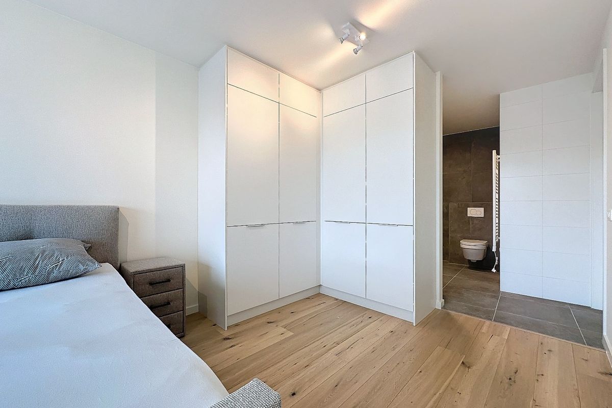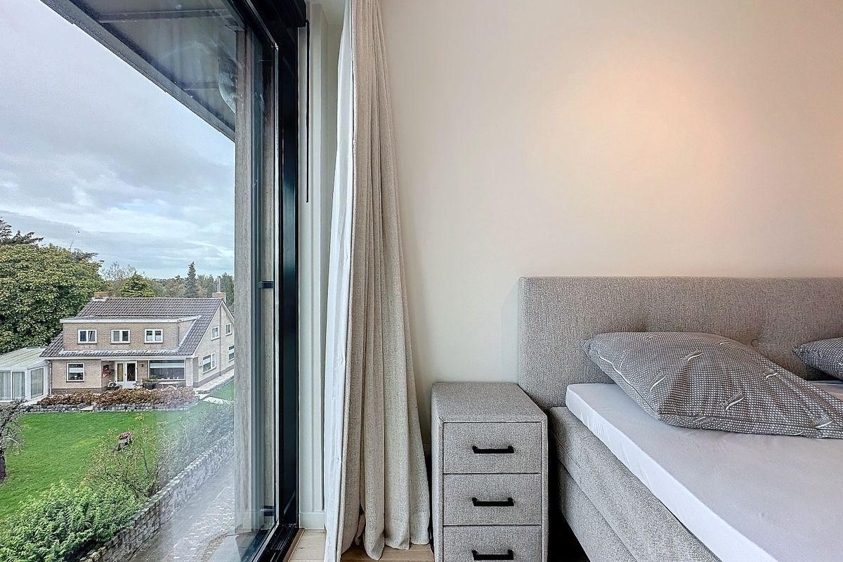 Via de woonkamer stap je zo het eerste terras op van ongeveer 13 m². Vanuit de hal, die voorzien is van een gastentoilet, bereik je de eerste slaapkamer van 18 m², evenals de luxe badkamer met inloopdouche, toilet en dubbele wastafel. Een trap leidt naar de derde verdieping, waar een tweede lichte zitkamer te vinden is, samen met een volledig ingerichte tweede keuken. Op deze verdieping bevindt zich ook de tweede slaapkamer met een eigen badkamer, uitgerust met inloopdouche, toilet en wastafelmeubel. Beide kamers bieden toegang tot een ruim terras van circa 24 m², gericht op het westen, waar je kunt genieten van schitterende uitzichten. De zitkamer kan gemakkelijk worden omgebouwd tot een derde slaapkamer. Verder is er op deze verdieping een apart toilet en een praktische berging voor de Cv-ketel.