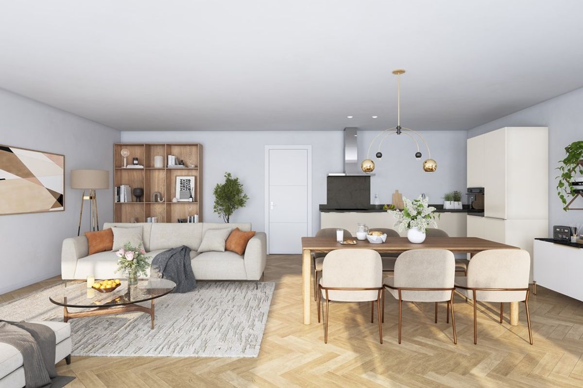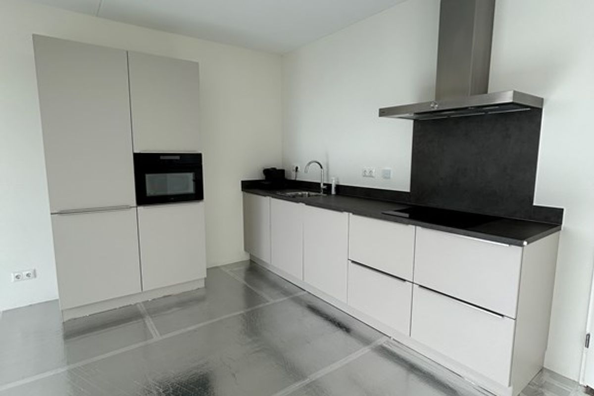 De open keuken is voorzien van hoogwaardige inbouwapparatuur van ATAG (inductie kookplaat, afzuigkap, koel-/ vriescombinatie, vaatwasser en combimagnetron). Woonkamer met toegang tot het balkon.
