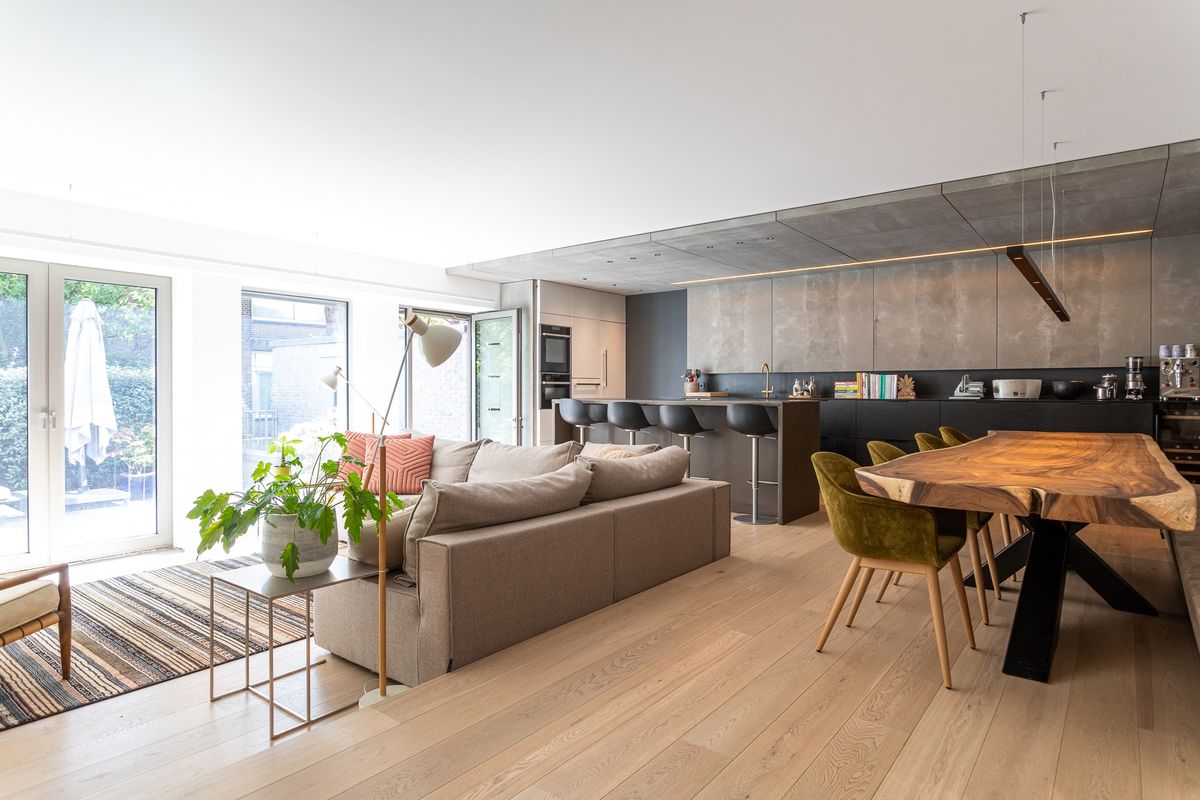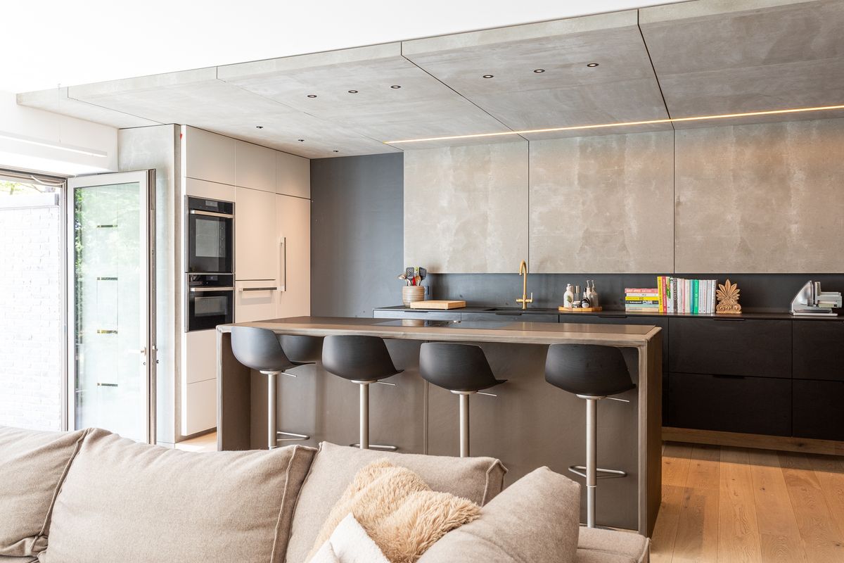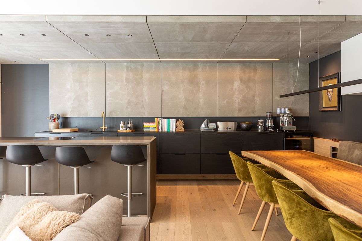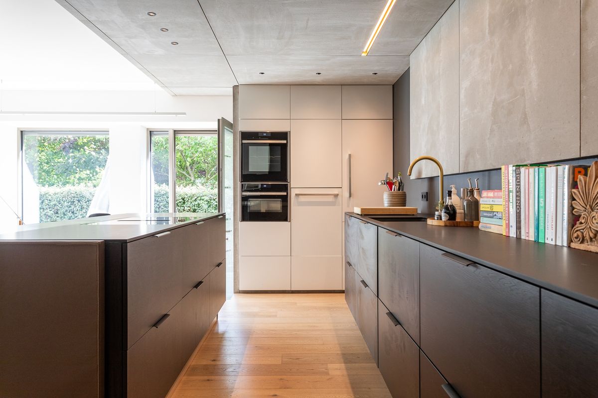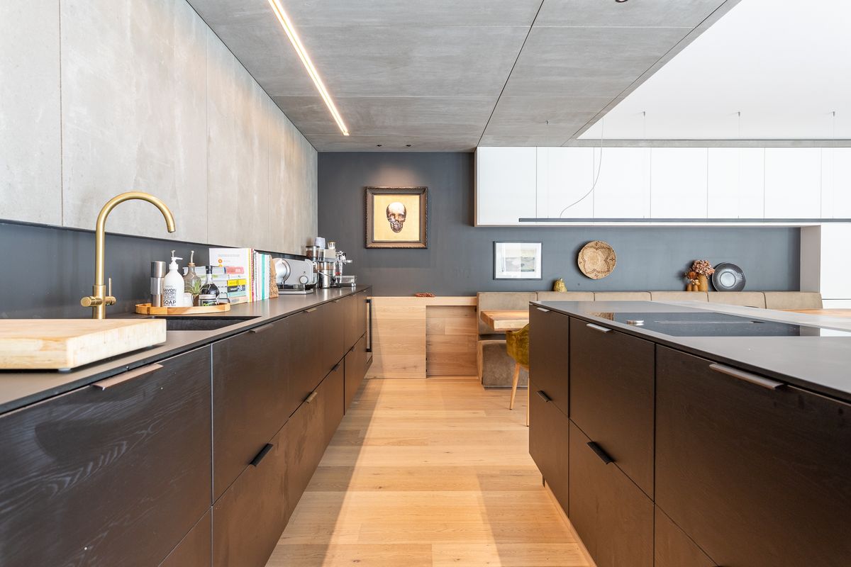 • Luxe maatwerkinterieur: kasten in Viroc-panelen (beton- en houtvezel), white-wash eiken en zwart fineerhout