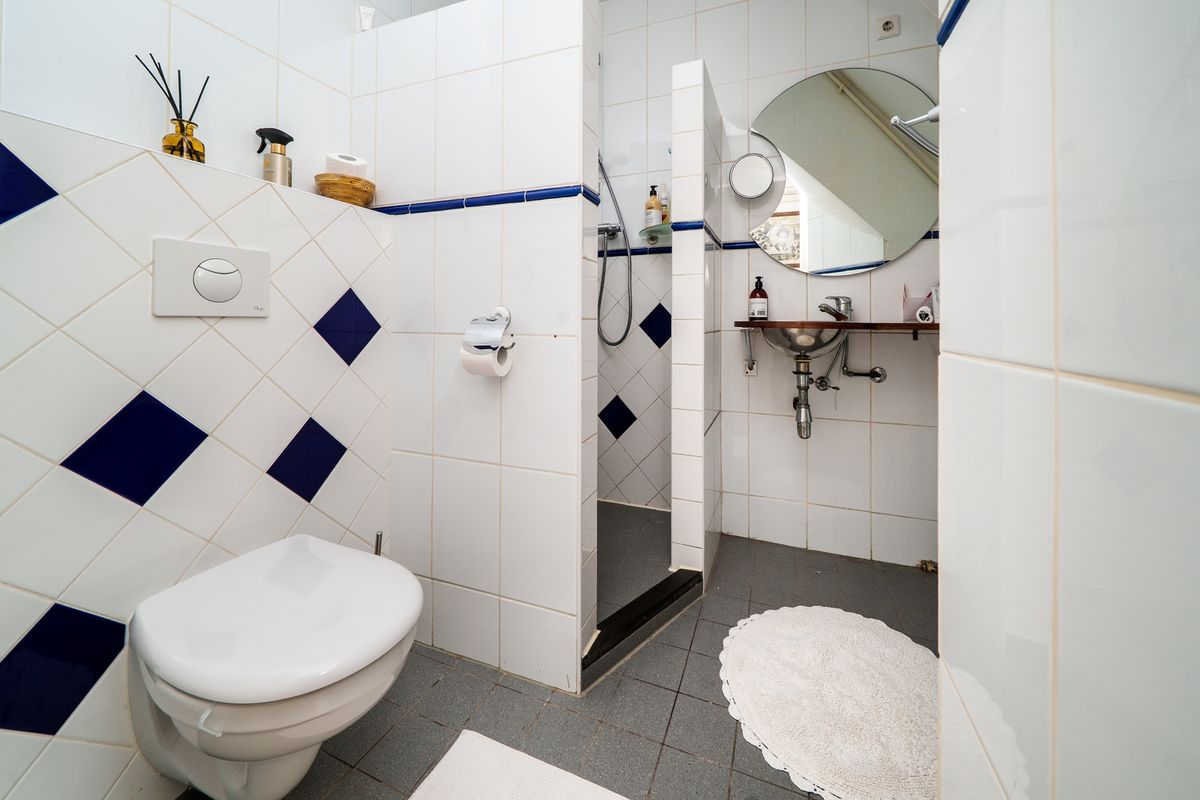 De badkamer is compleet ingericht met een ruime inloopdouche, een