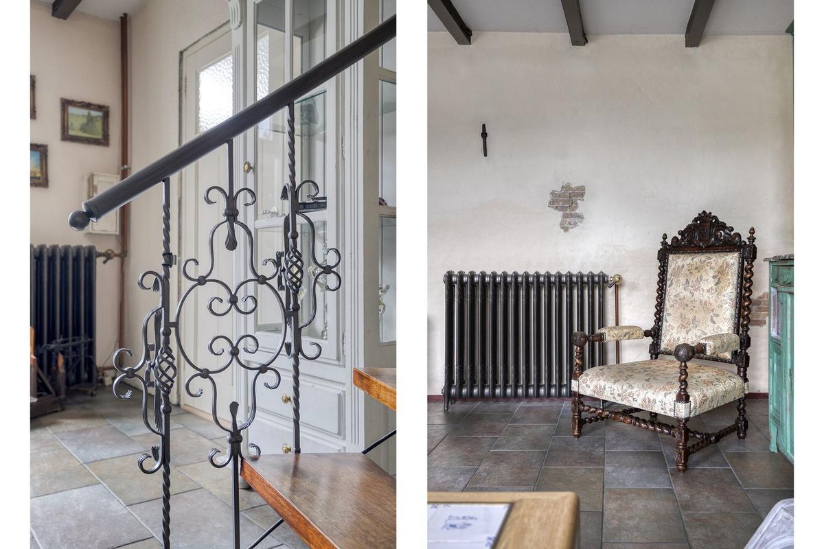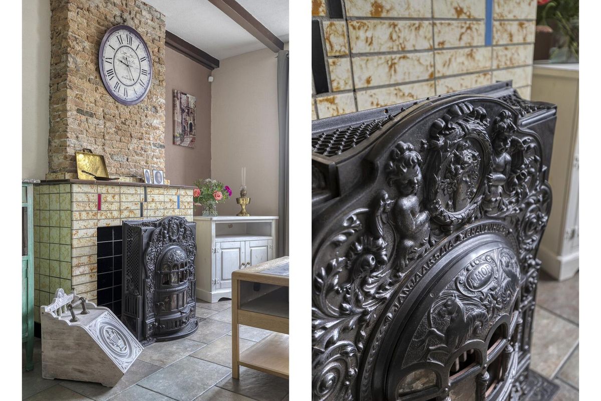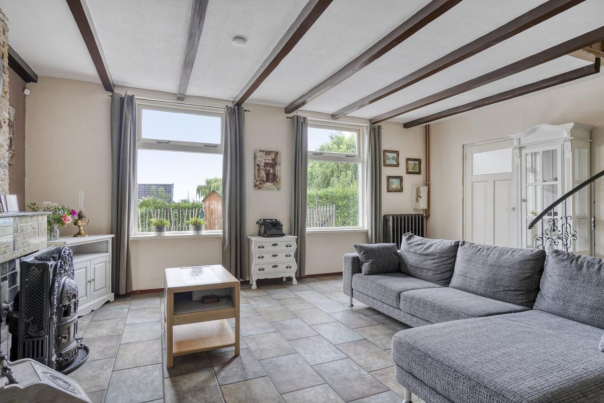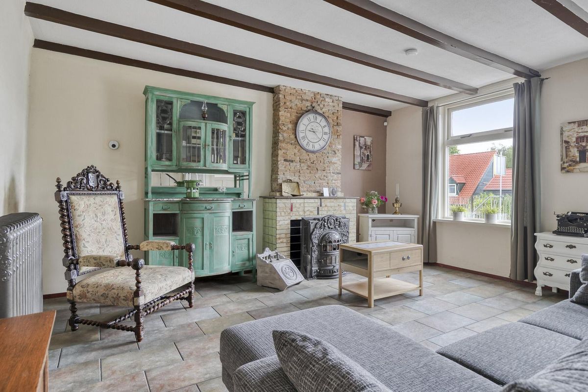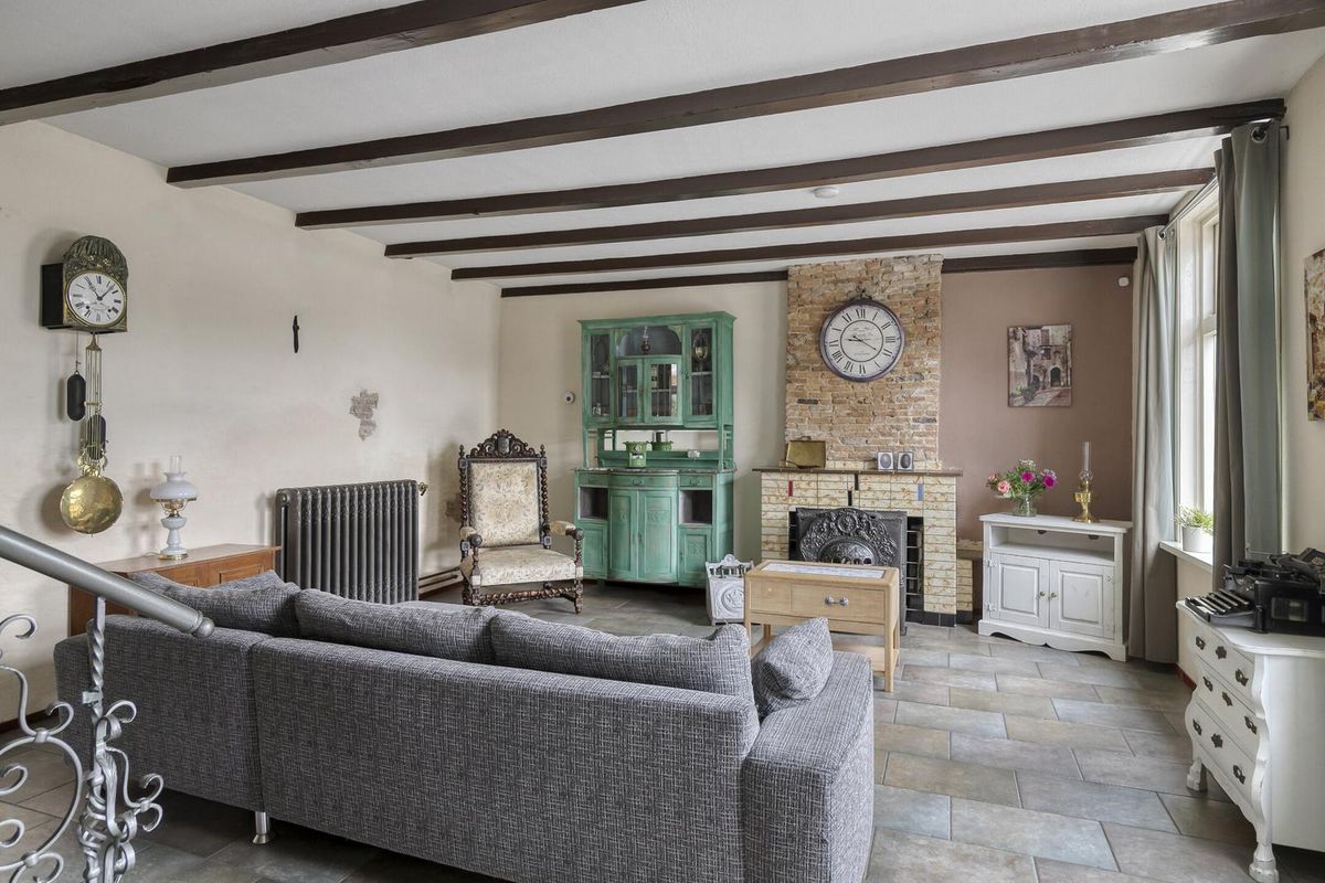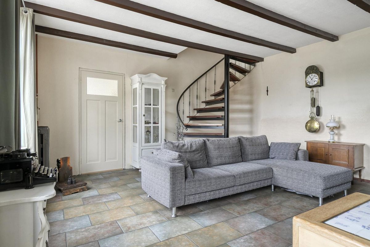 Sfeervolle living met balkenplafond, met sfeervolle sierhaard met voorzetschouw en twee antieke gietijzeren radiatoren. Een sierlijke open spiraaltrap brengt u naar de eerste verdieping. Via de woonkamer is er toegang tot hal en de 1e verdieping. Onder de woonkamer bevindt zich een zogenaamde “aardappelkelder" van circa 1x6 meter (bereikbaar vanaf de keuken en bijkeuken).