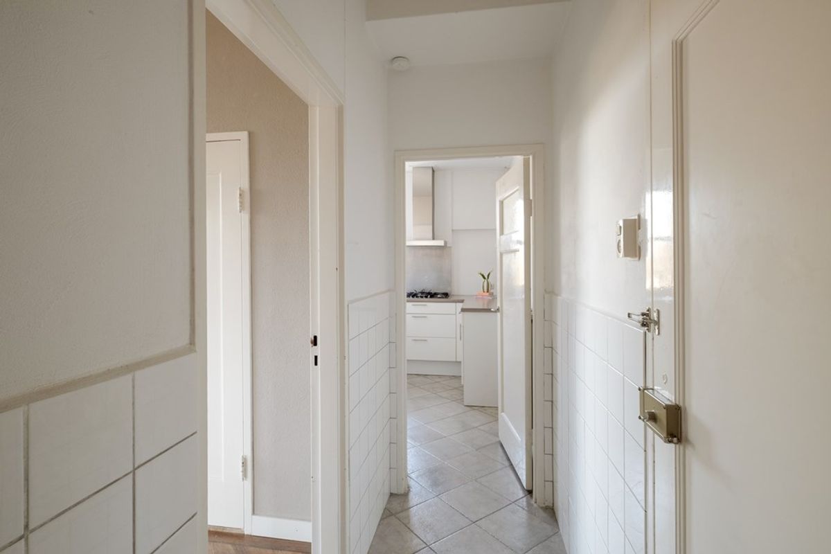 Via de statige centrale entree van het karakteristieke Koningin Wilhelmina-gebouw bereik je het appartement op de vierde verdieping. Bij binnenkomst in het appartement kom je in de hal die toegang geeft tot de verschillende vertrekken. Aan de linkerzijde bevindt zich het separate toilet met fonteintje. Aan de rechterzijde ligt de keuken. Wanneer je rechtdoor loopt, kom je in de sfeervolle woonkamer.