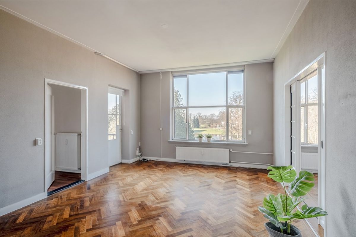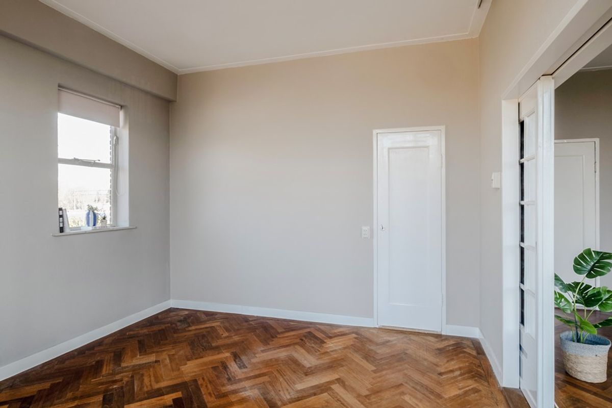 De woonkamer vormt het hart van het appartement. Dankzij de grote raampartijen valt het daglicht hier royaal naar binnen en geniet je van een prachtig, vrij uitzicht over het Volkspark. De originele suite-deuren geven de ruimte een elegant en karaktervol detail en versterken de authentieke sfeer van het appartement.