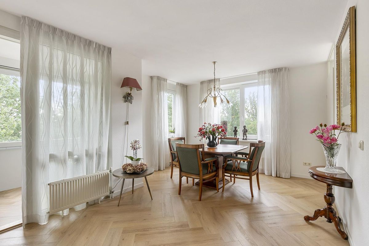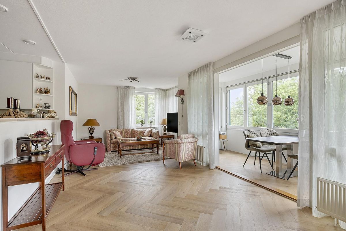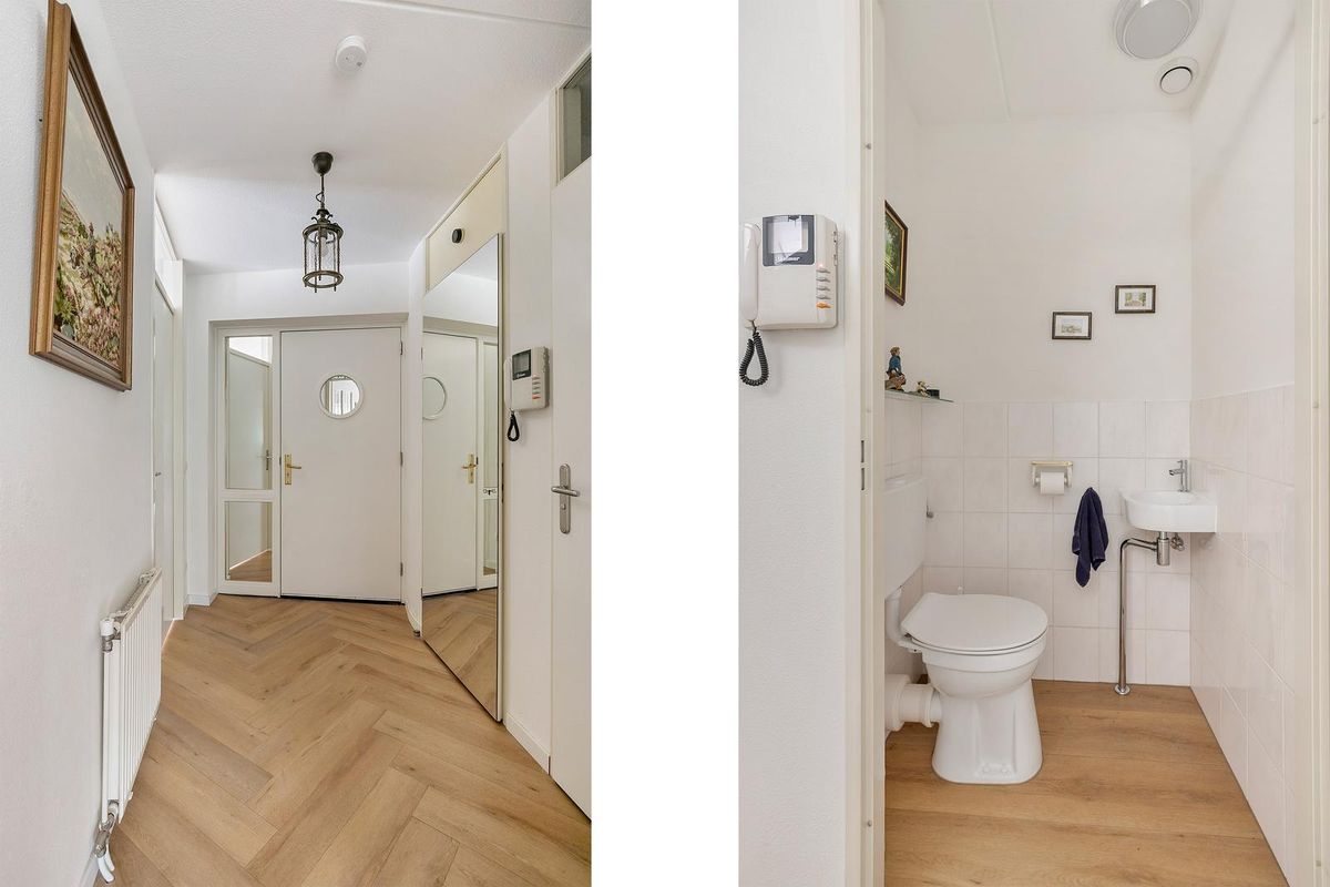 Appartement: vanuit de hal – met videofooninstallatie en berg-/meterkast - is er toegang tot het toilet (met hoekfontein), de slaapkamer en de royale woonkamer. De stijlvolle (geluiddempende) PVC-visgraatvloer loopt vanuit de hal door in de opvallend lichte woonkamer. De huidige eetkamer, nu onderdeel van de woonkamer uitmakende, kan eenvoudig worden teruggebracht tot een tweede slaapkamer. De loggia (het inpandige balkon), volledig afsluitbaar met schuiframen, vormt een verlengstuk van de woonkamer en laat volop daglicht binnenstromen. Een mooie verbindende ruimte tussen binnen en buiten.