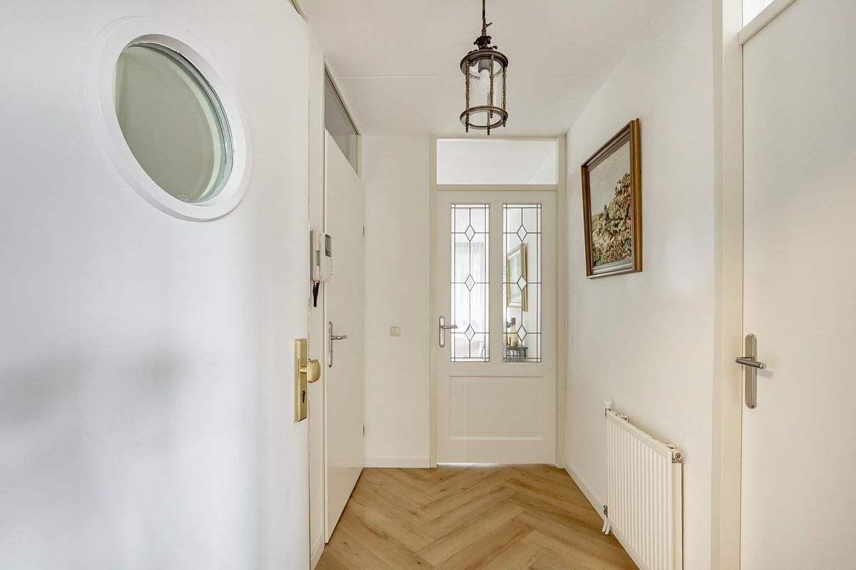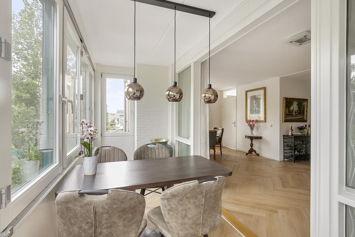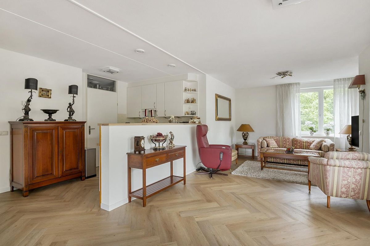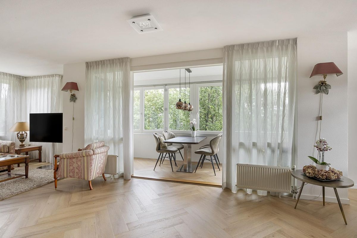Appartement: vanuit de hal – met videofooninstallatie en berg-/meterkast - is er toegang tot het toilet (met hoekfontein), de slaapkamer en de royale woonkamer. De stijlvolle (geluiddempende) PVC-visgraatvloer loopt vanuit de hal door in de opvallend lichte woonkamer. De huidige eetkamer, nu onderdeel van de woonkamer uitmakende, kan eenvoudig worden teruggebracht tot een tweede slaapkamer. De loggia (het inpandige balkon), volledig afsluitbaar met schuiframen, vormt een verlengstuk van de woonkamer en laat volop daglicht binnenstromen. Een mooie verbindende ruimte tussen binnen en buiten.