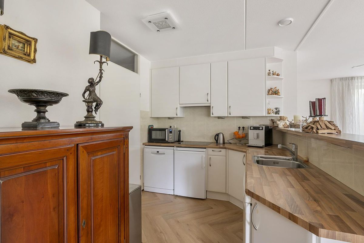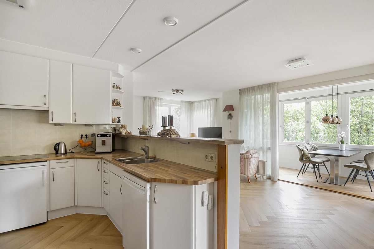 De open keuken in l-vorm is uitgevoerd in een zachte crème tint met houten werkblad en beschikt over een ceramische kookplaat, afzuigkap, uitgebreide spoelbak en plek voor bijvoorbeeld een vaatwasser, koelkast en diepvries. Vanuit de keuken is er toegang tot een praktische berging met witgoedaansluitingen, extra bergruimte en de cv-installatie (Intergas HRE, type 2022, eigendom).