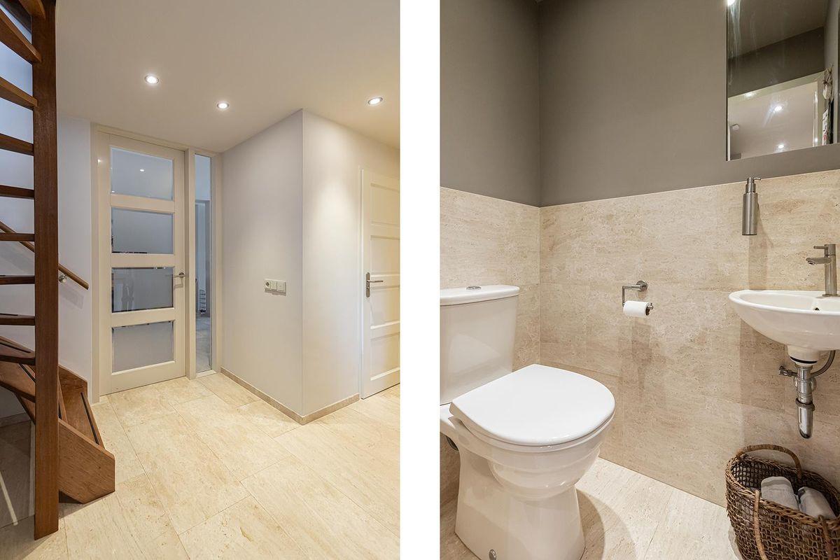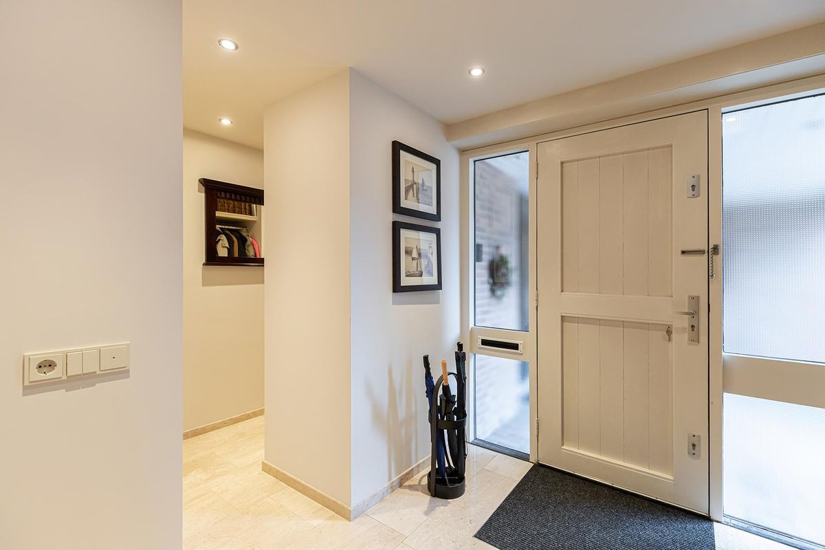 De ruime hal met natuurstenen vloer en vloerverwarming biedt toegang tot de moderne toiletruimte, de inpandige garage en de woonkamer. De hal is royaal opgezet en biedt voldoende ruimte voor een garderobe.