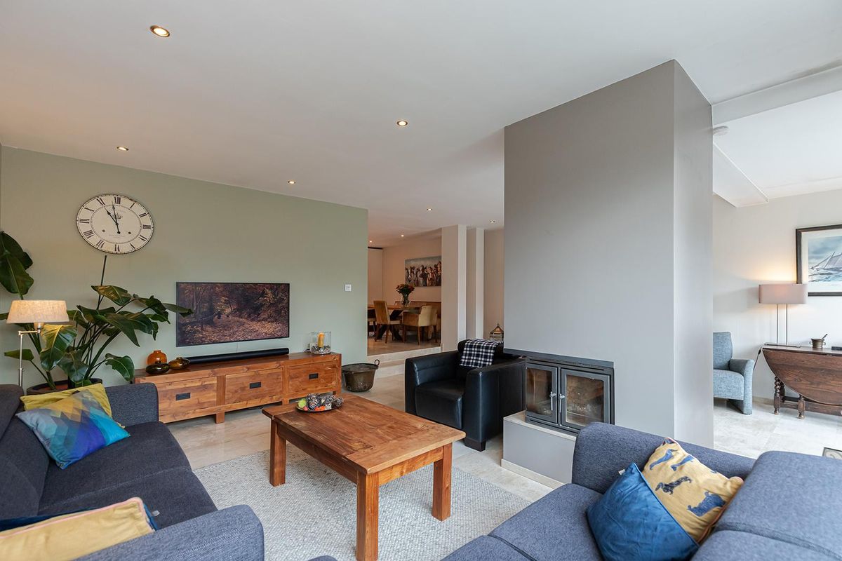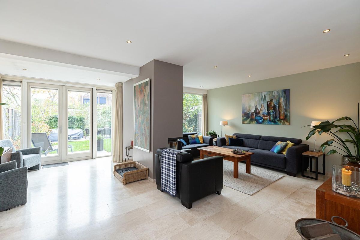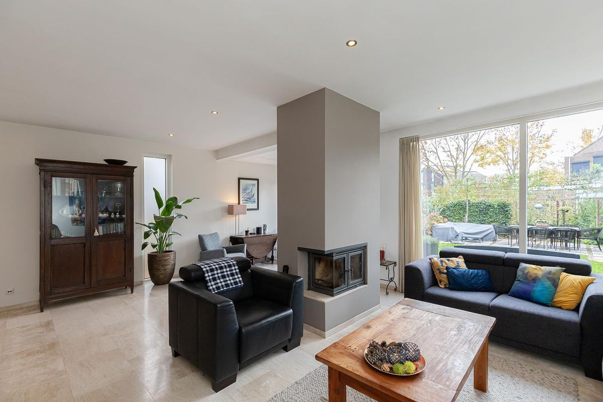 De woonkamer is een heerlijke leefruimte met een vrijwel volledig glazen achtergevel, waardoor het daglicht rijkelijk binnenvalt en het zicht op de groene tuin fantastisch is. De moderne open haard vormt een sfeervol middelpunt en via openslaande deuren stap je direct het terras op.