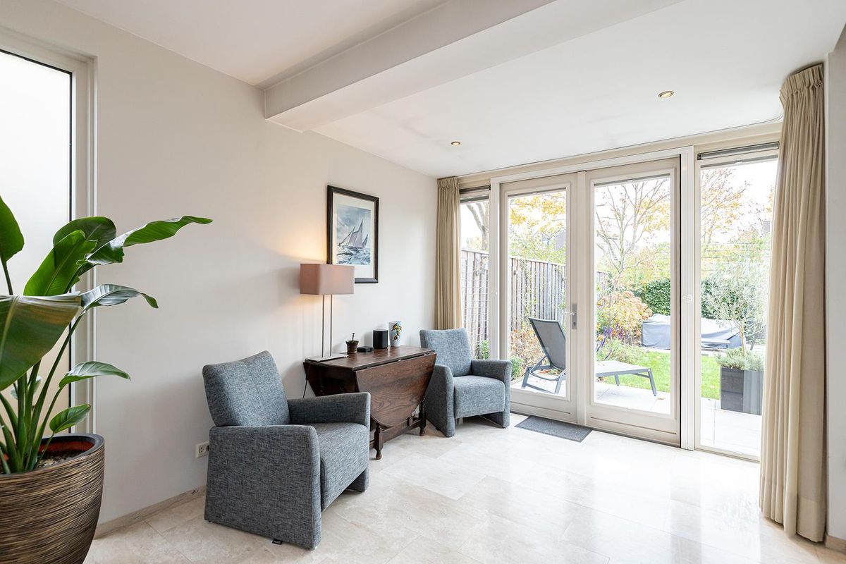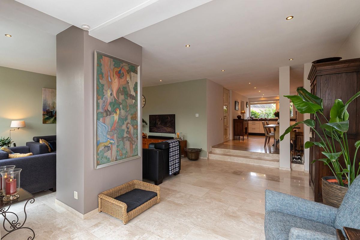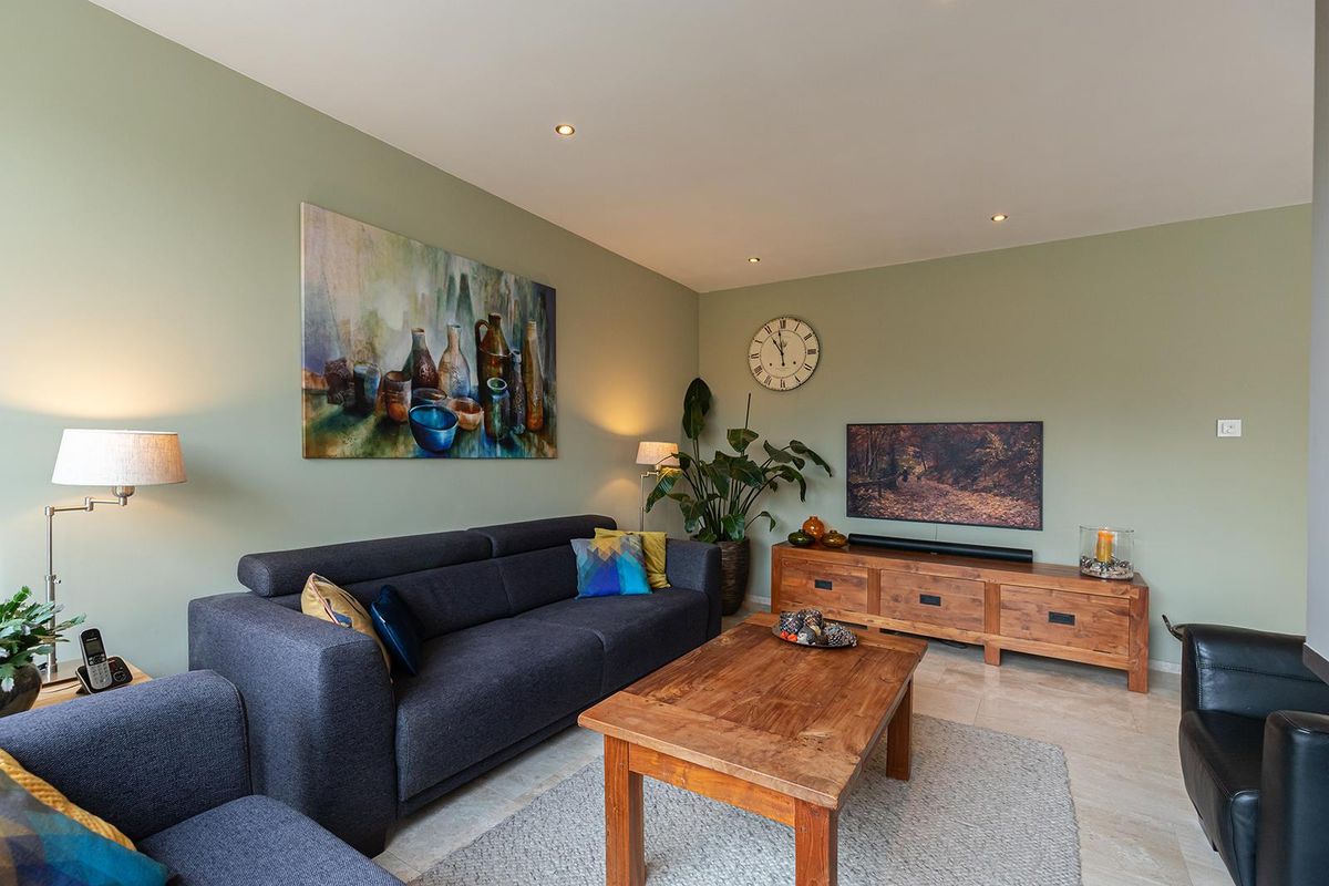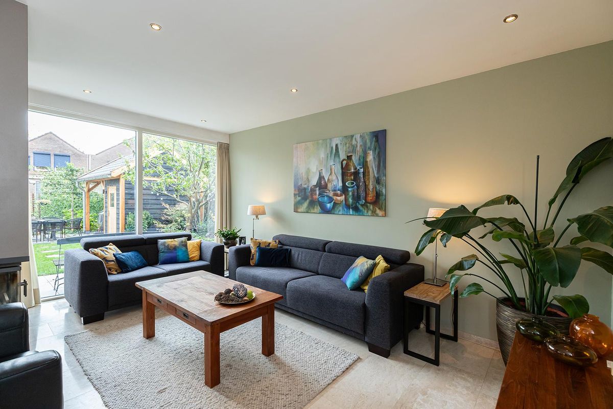 De woonkamer is een heerlijke leefruimte met een vrijwel volledig glazen achtergevel, waardoor het daglicht rijkelijk binnenvalt en het zicht op de groene tuin fantastisch is. De moderne open haard vormt een sfeervol middelpunt en via openslaande deuren stap je direct het terras op.