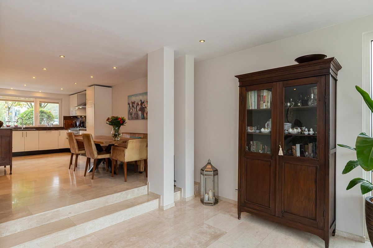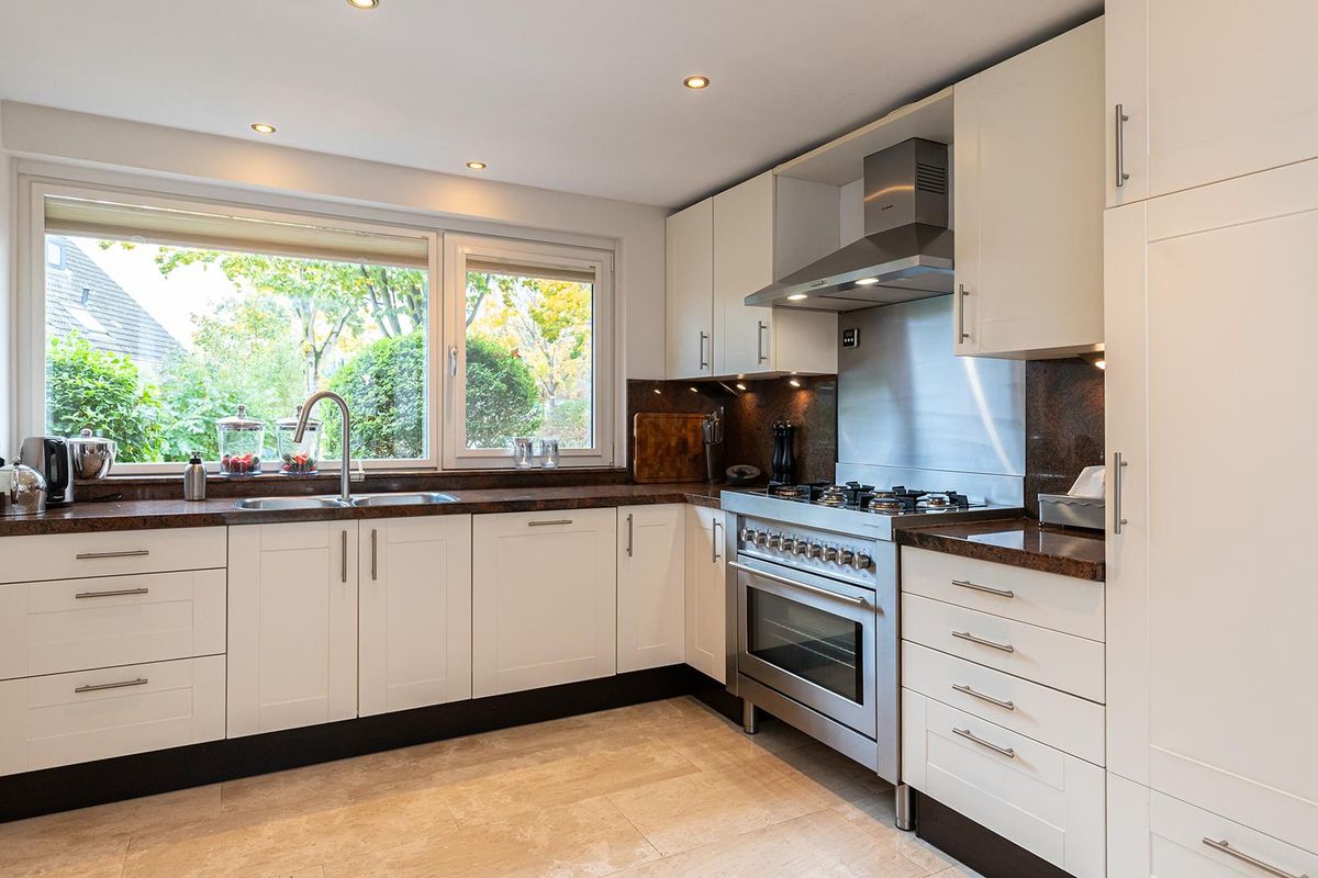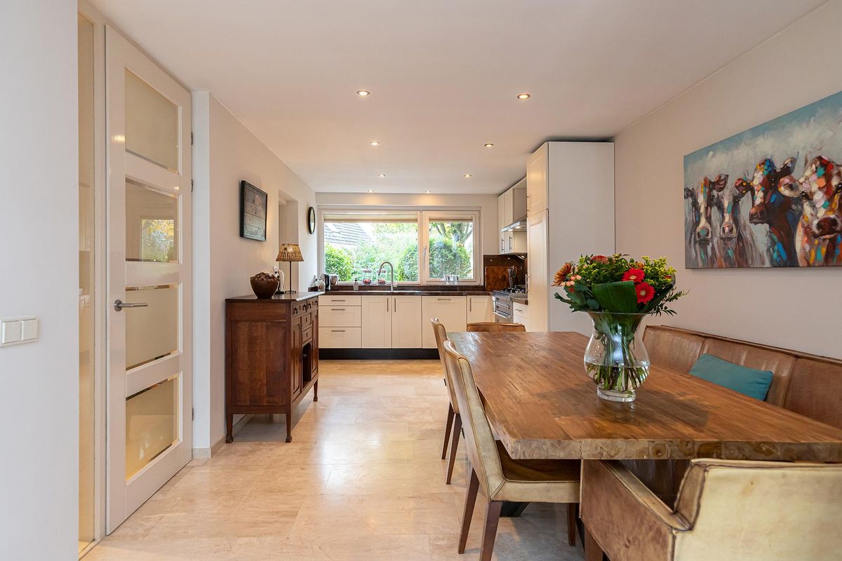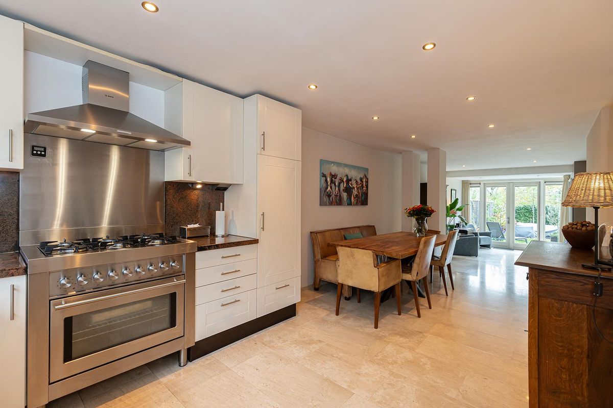 Een klein niveauverschil leidt naar de woonkeuken aan de voorzijde, met genoeg plaats voor een grote eethoek – perfect om uitgebreid te tafelen met familie en vrienden. De keuken is uitgevoerd in een Grando keukeninrichting (2008) in cremekleur met een zachtbruin marmeren werkblad en voorzien van een 6-pits fornuis met oven, afzuigkap, vaatwasser, koelkast en vriezer.