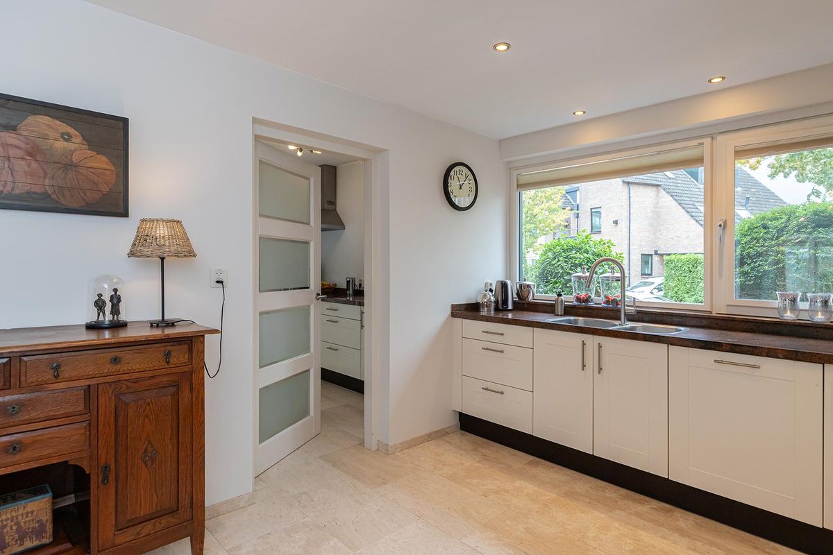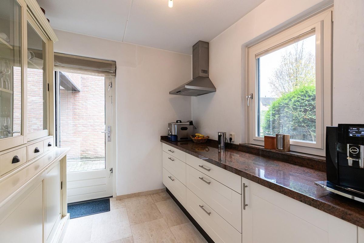 Aangrenzend bevindt zich de bijkeuken met extra keukenblok in dezelfde stijl, compleet met natuurstenen werkblad, afzuigkap en veel kastruimte. Via een deur is er directe toegang tot de oprit – praktisch voor dagelijks gebruik.