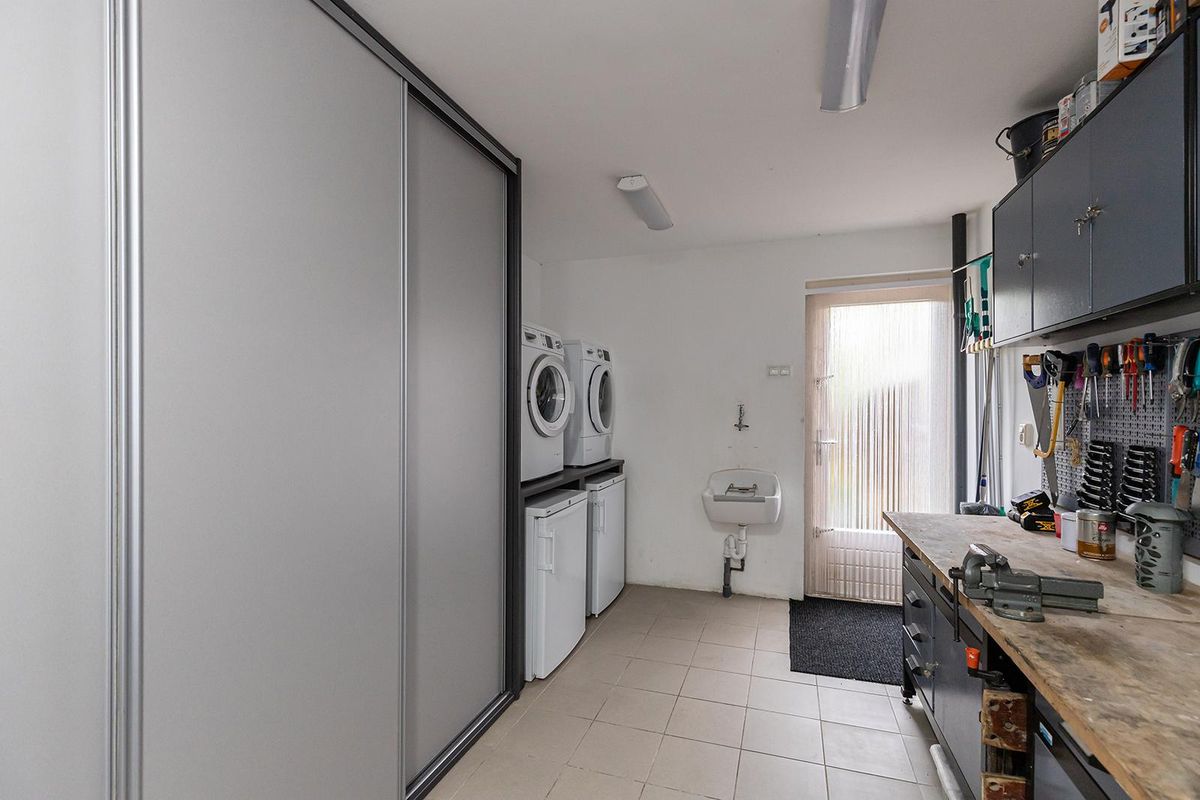 De inpandige garage is keurig afgewerkt met plavuizen vloer, gestuukte wanden, elektra, water en een uitstortgootsteen. Er is volop ruimte voor extra apparatuur, zoals een koelkast, vriezer of wijnkoelkast, en een grote werkbank. Via een loopdeur is er toegang tot de tuin. Boven de garage bevindt zich een handige bergvliering, bereikbaar via een vlizotrap.
