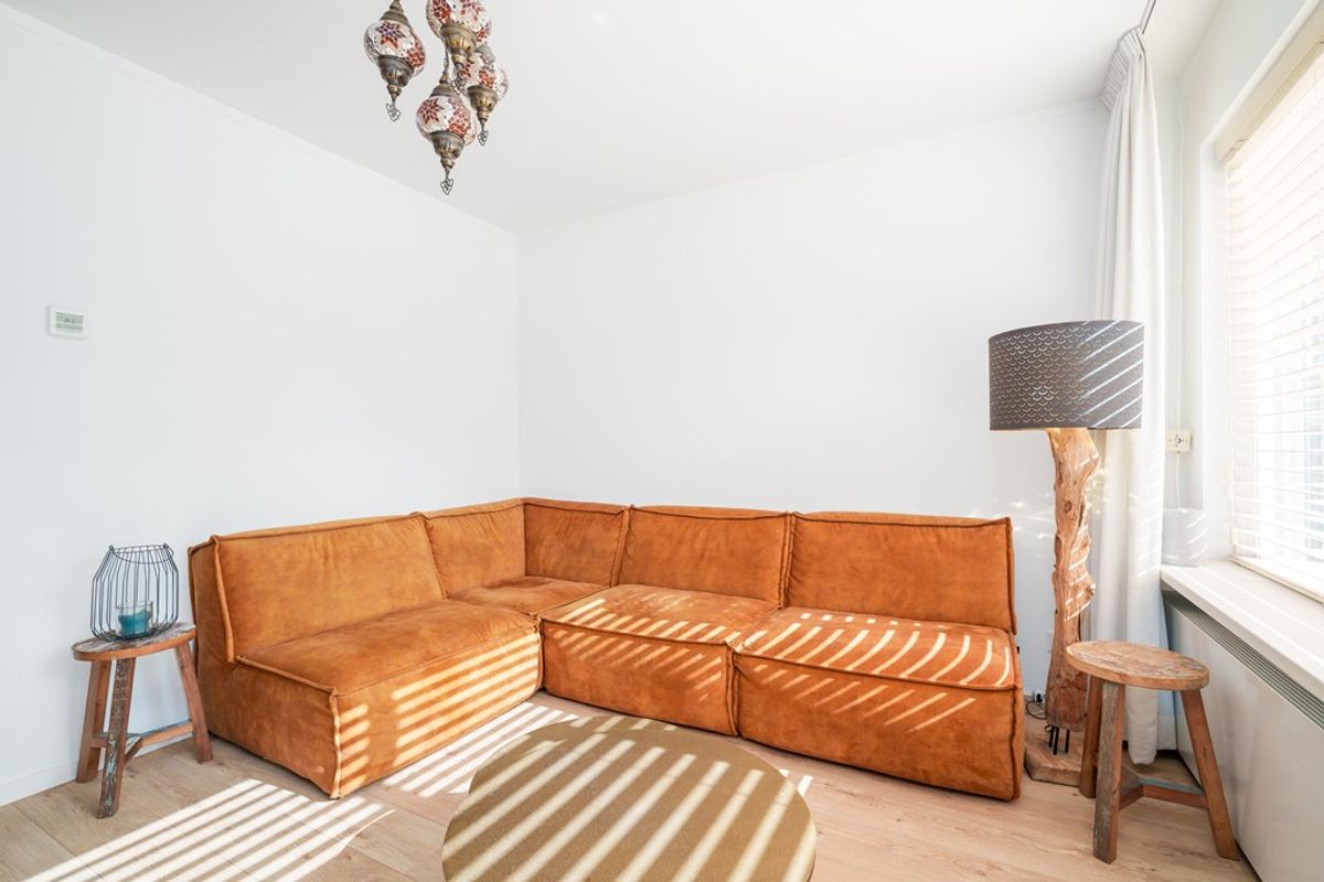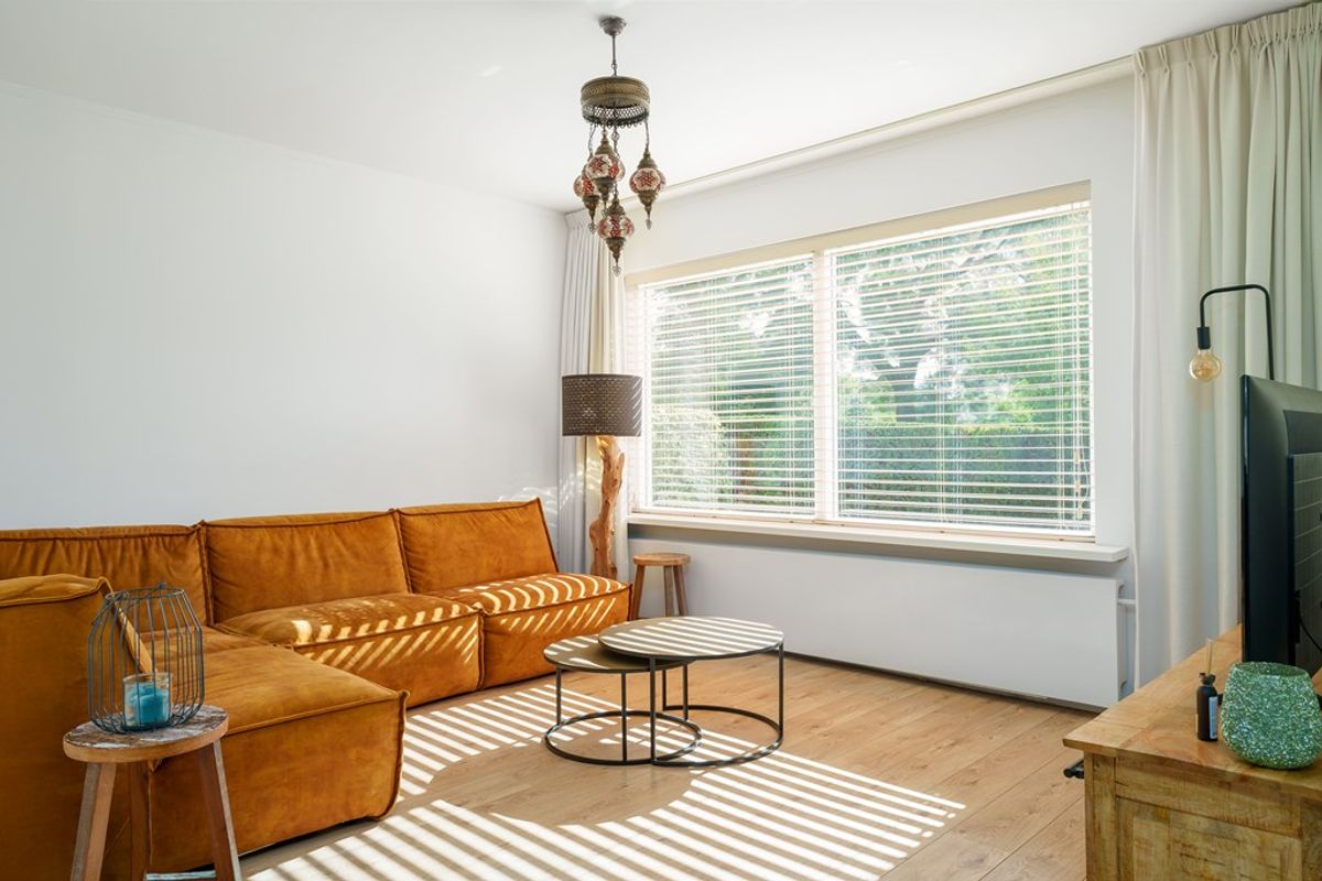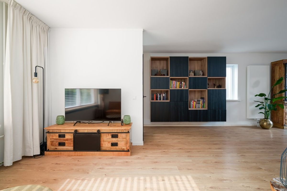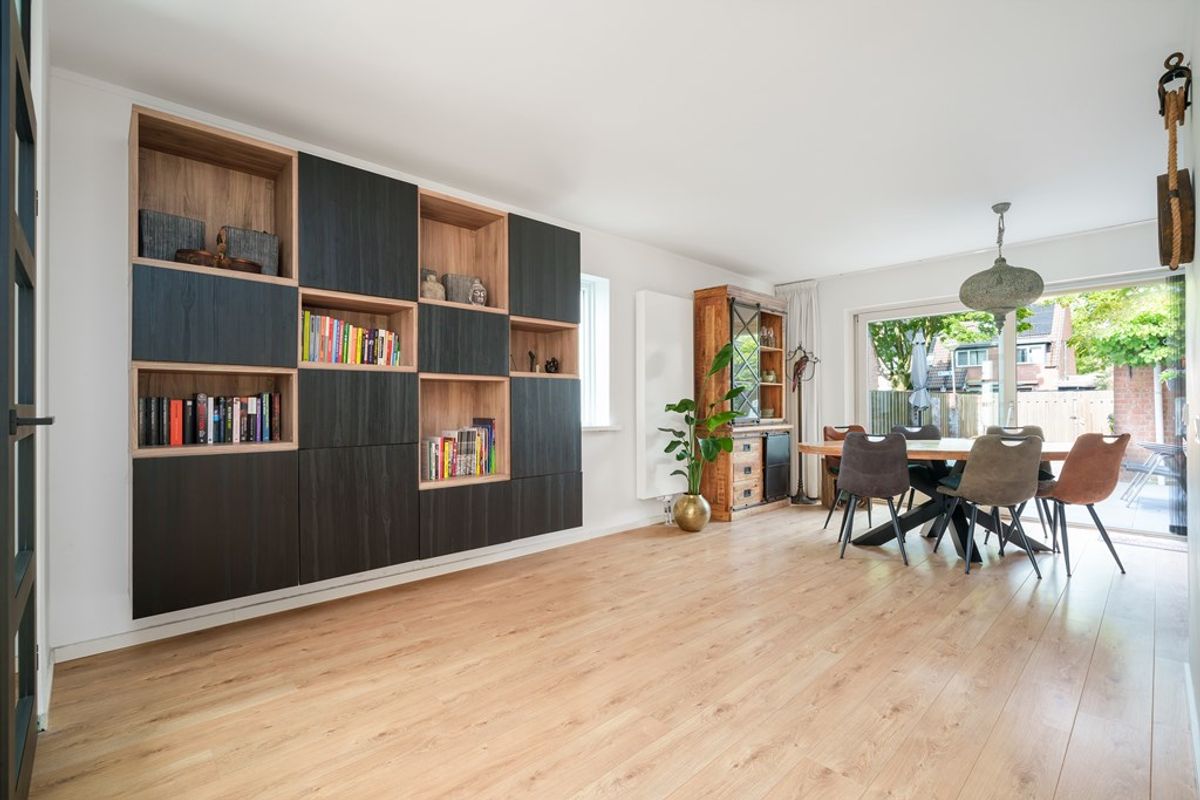 De zithoek aan de voorzijde is extra sfeervol door de grote raampartij. In het midden van de ruimte is plek voor een royale kast en de woonkamer loopt door naar de eethoek met schuifpui naar de achtertuin.