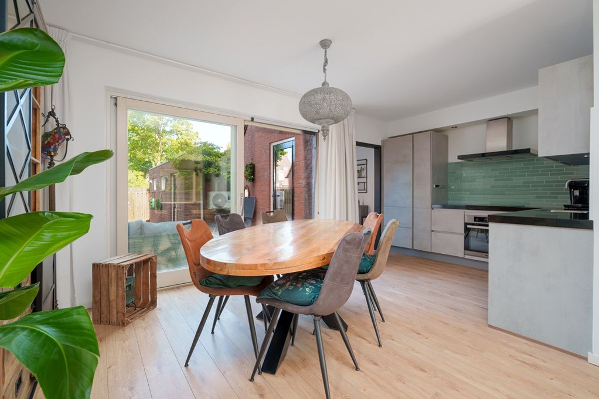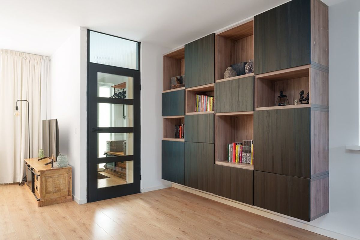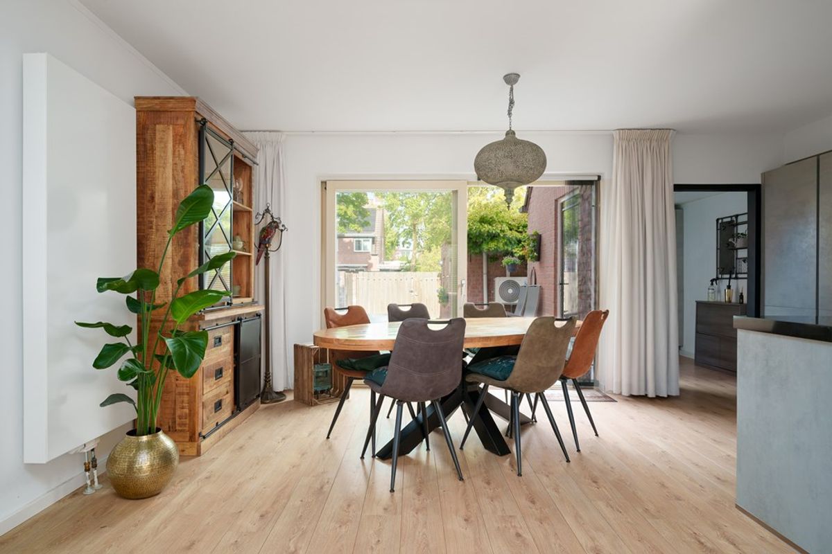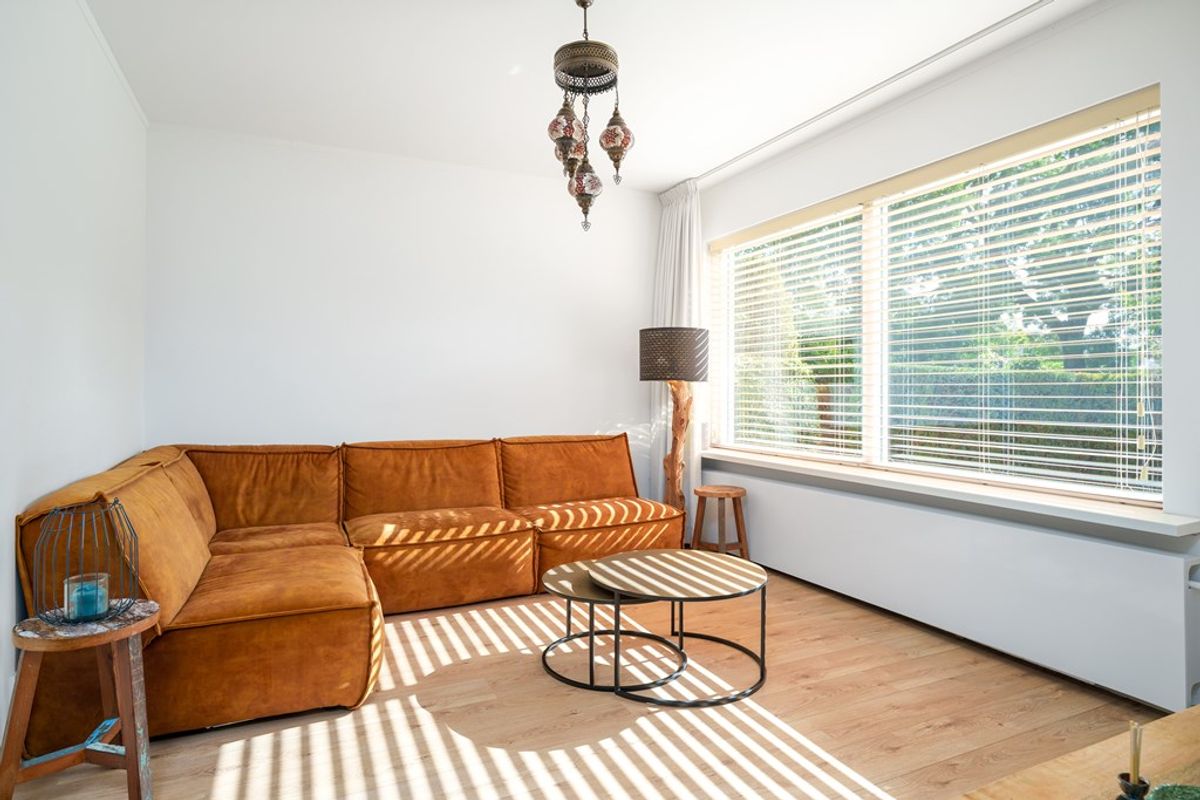 De zithoek aan de voorzijde is extra sfeervol door de grote raampartij. In het midden van de ruimte is plek voor een royale kast en de woonkamer loopt door naar de eethoek met schuifpui naar de achtertuin.