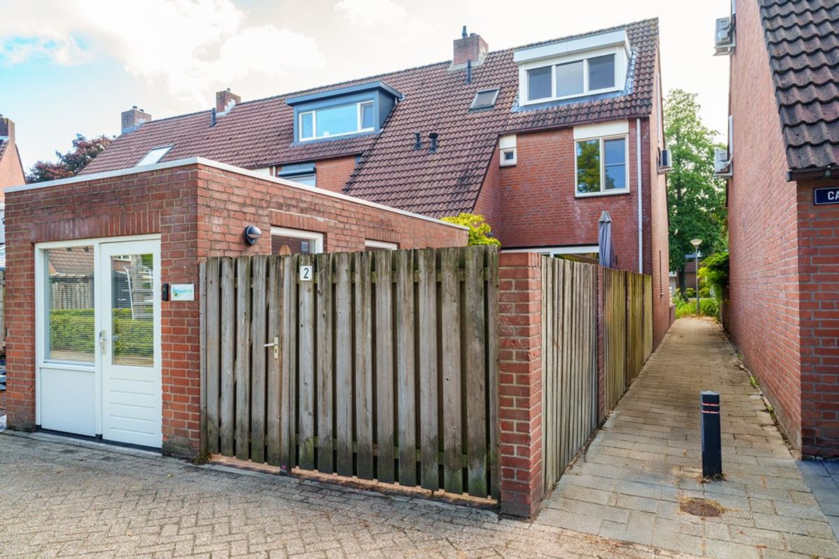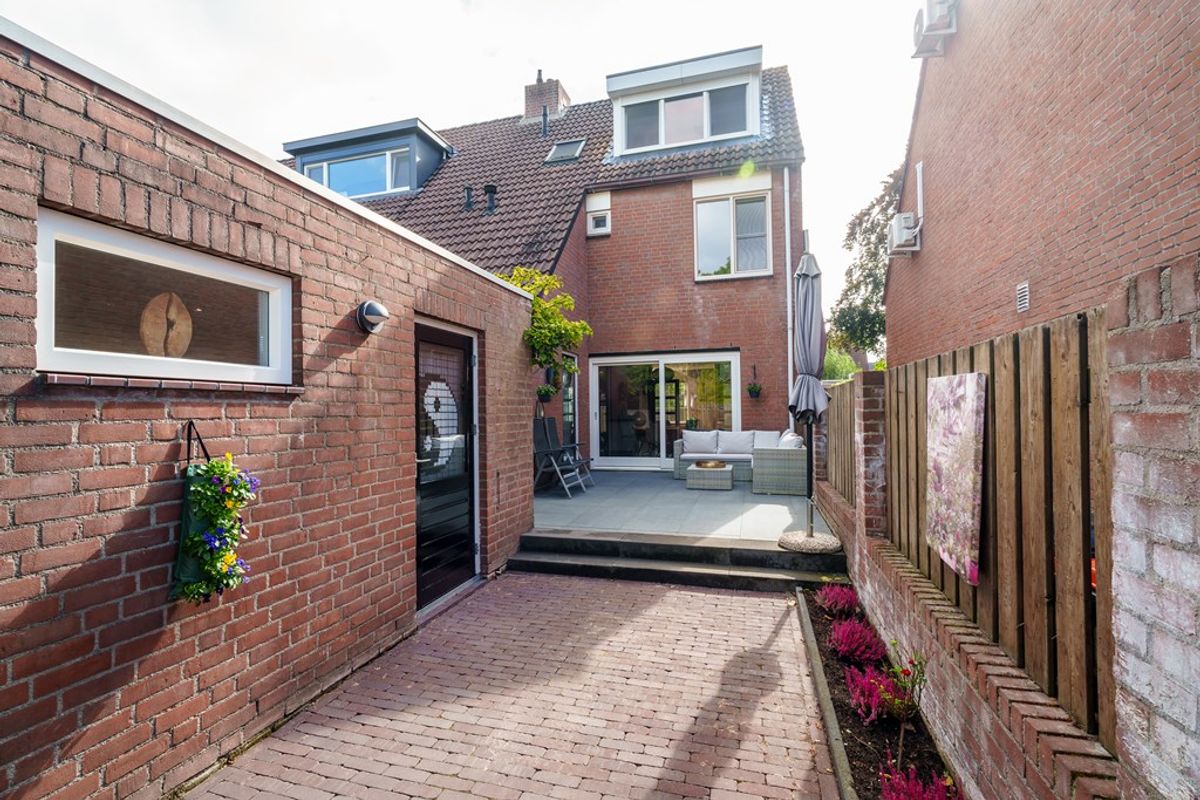 • Achtertuin: strak aangelegd met grote keramische tegels, achterom en een groene schutting met klimop.