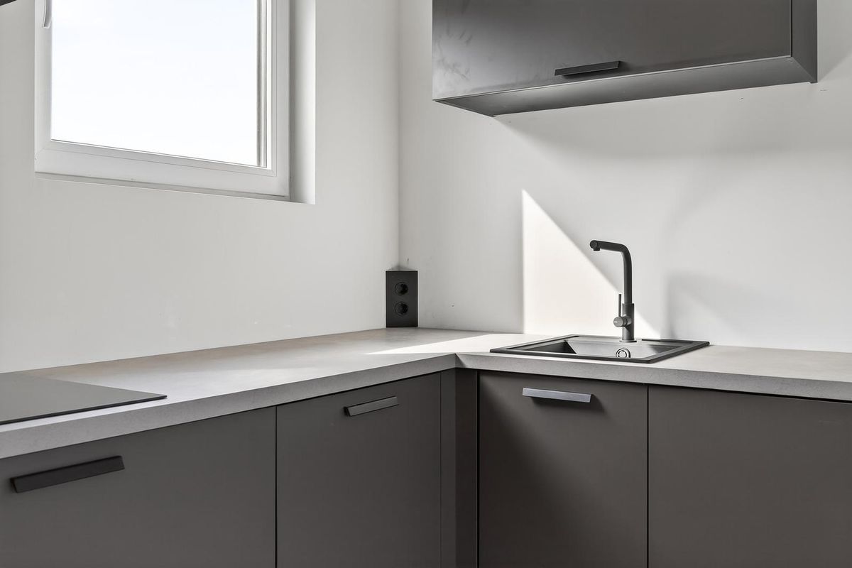 Donkerkleurige L-vormige moderne keuken aan de achterzijde met inbouwapparatuur.