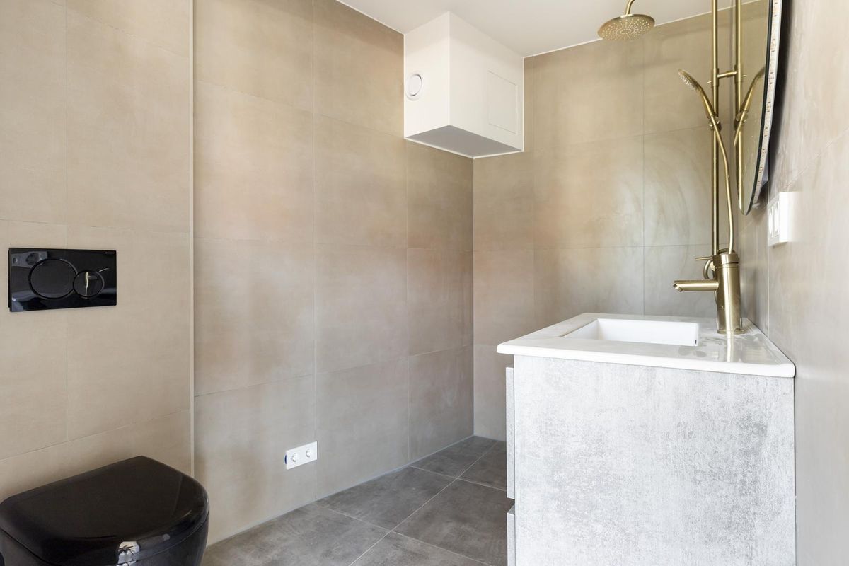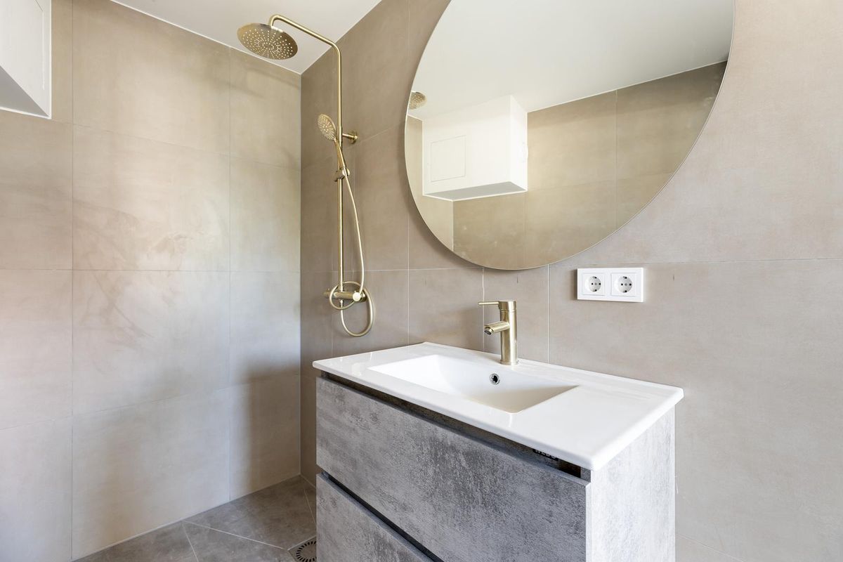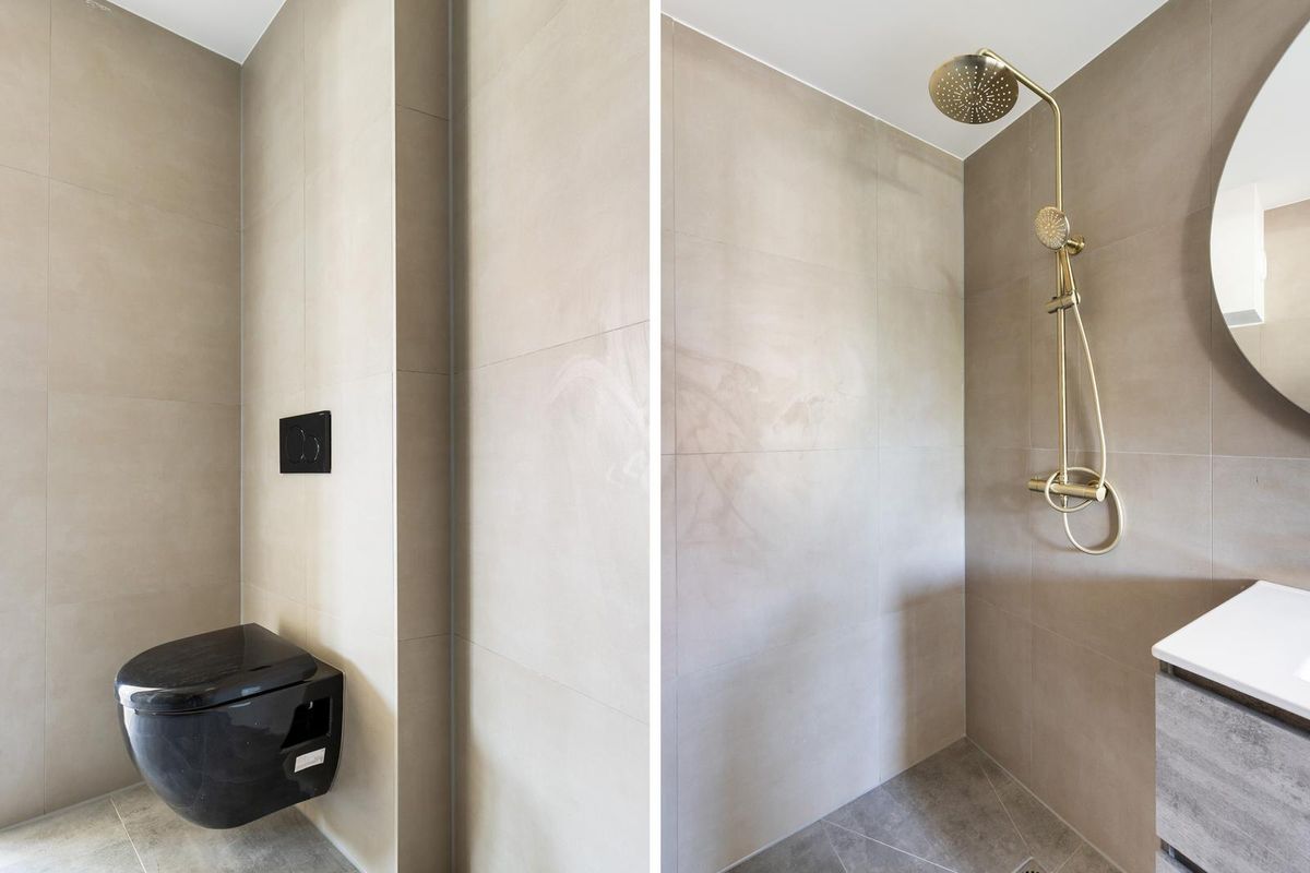 De slaapkamer en de moderne betegelde badkamer met inloopdouche, hangend toilet en wastafel bevinden zich aan de achterzijde.