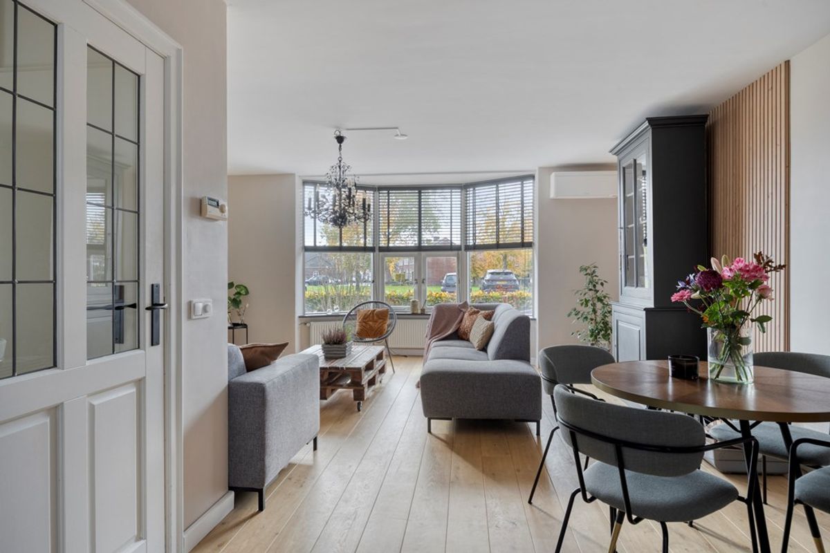 Zodra je binnenstapt, valt het je meteen op: wat een ruimte! Wat een licht! De uitgebouwde woonkamer doet uitnodigend aan. Dankzij de royale erker met grote ramen geniet je van prachtige zichtlijnen naar buiten én stroomt het daglicht rijkelijk naar binnen. Airconditioning houdt ‘t hier zomer en winter aangenaam koel of juist behaaglijk warm – luxe die je na één seizoen niet meer wilt missen.