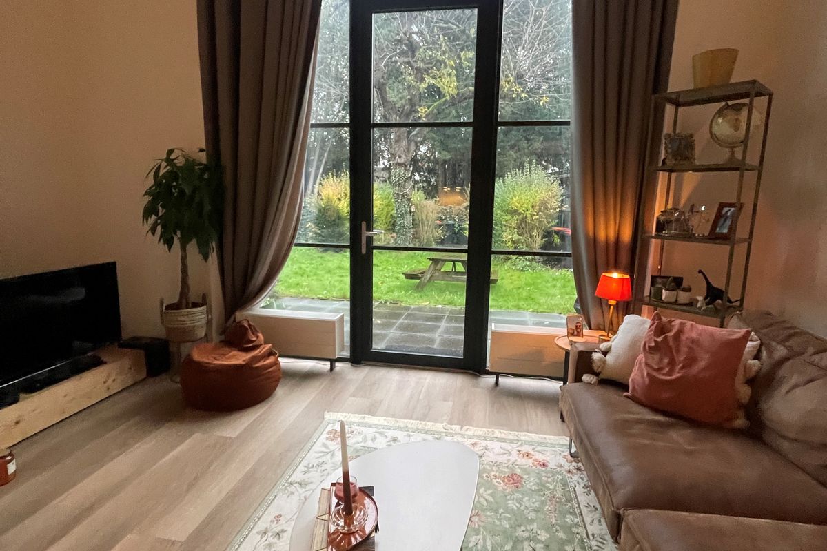 De woonkamer is ca. 36m2 en heeft een hoog plafond met veel lichtinval en openslaande deuren naar de tuin.