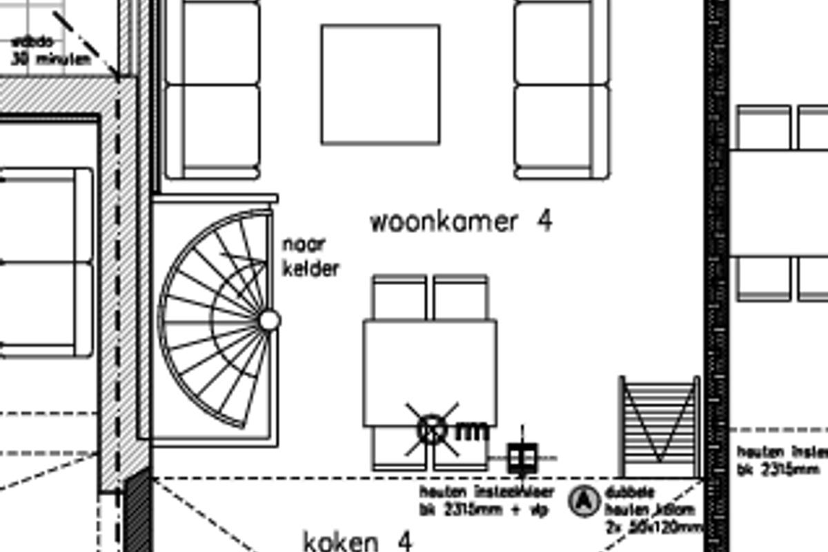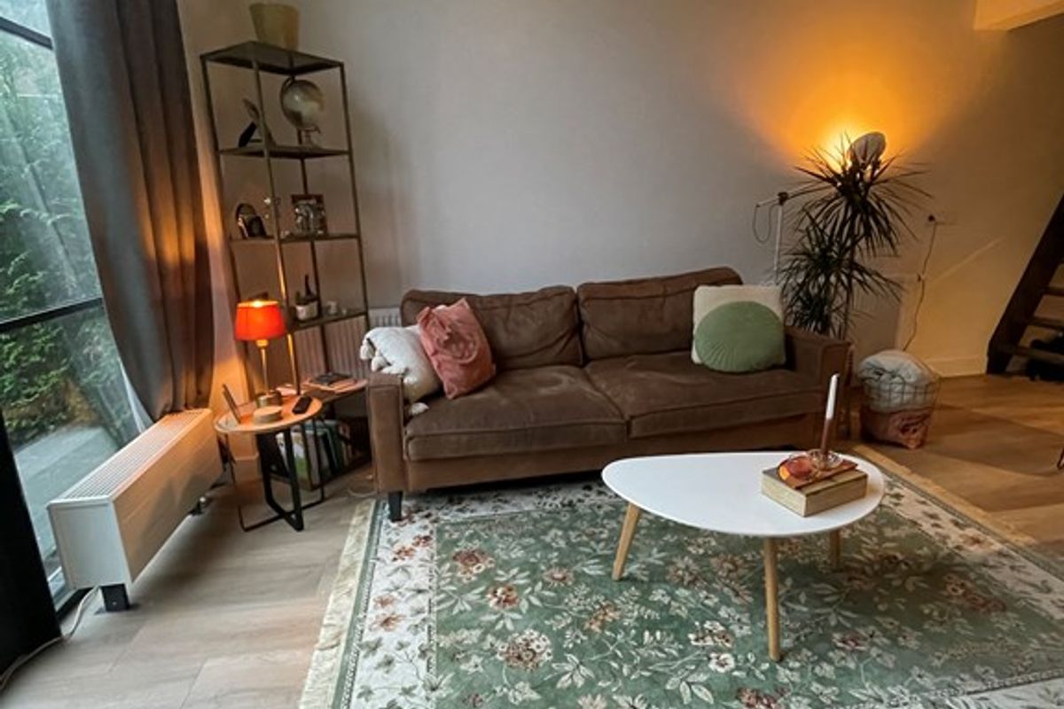 De woonkamer is ca. 36m2 en heeft een hoog plafond met veel lichtinval en openslaande deuren naar de tuin.