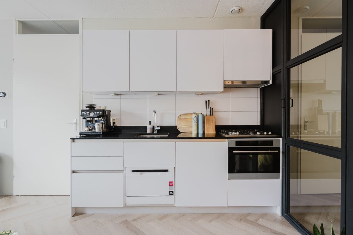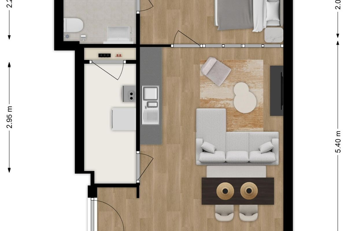Via de woonkamer bereik je de slaapkamer welke is voorzien van een praktische en sfeervolle oplossing door middel van een glazen wandafscheiding. Hierdoor komt er in de slaapkamer voldoende lichtinval binnen.