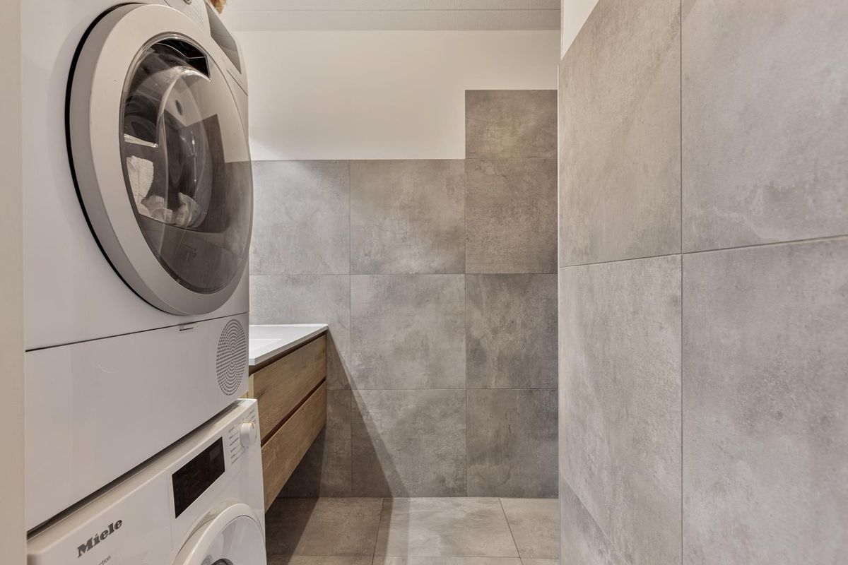 - Badkamer: De badkamer is modern en luxe afgewerkt met grote grijze tegels. Hier vind je een ruime inloopdouche, een wastafel met een modern houten meubel en een spiegelkast. Daarnaast is er een praktische aansluiting voor wasmachine en droger;
