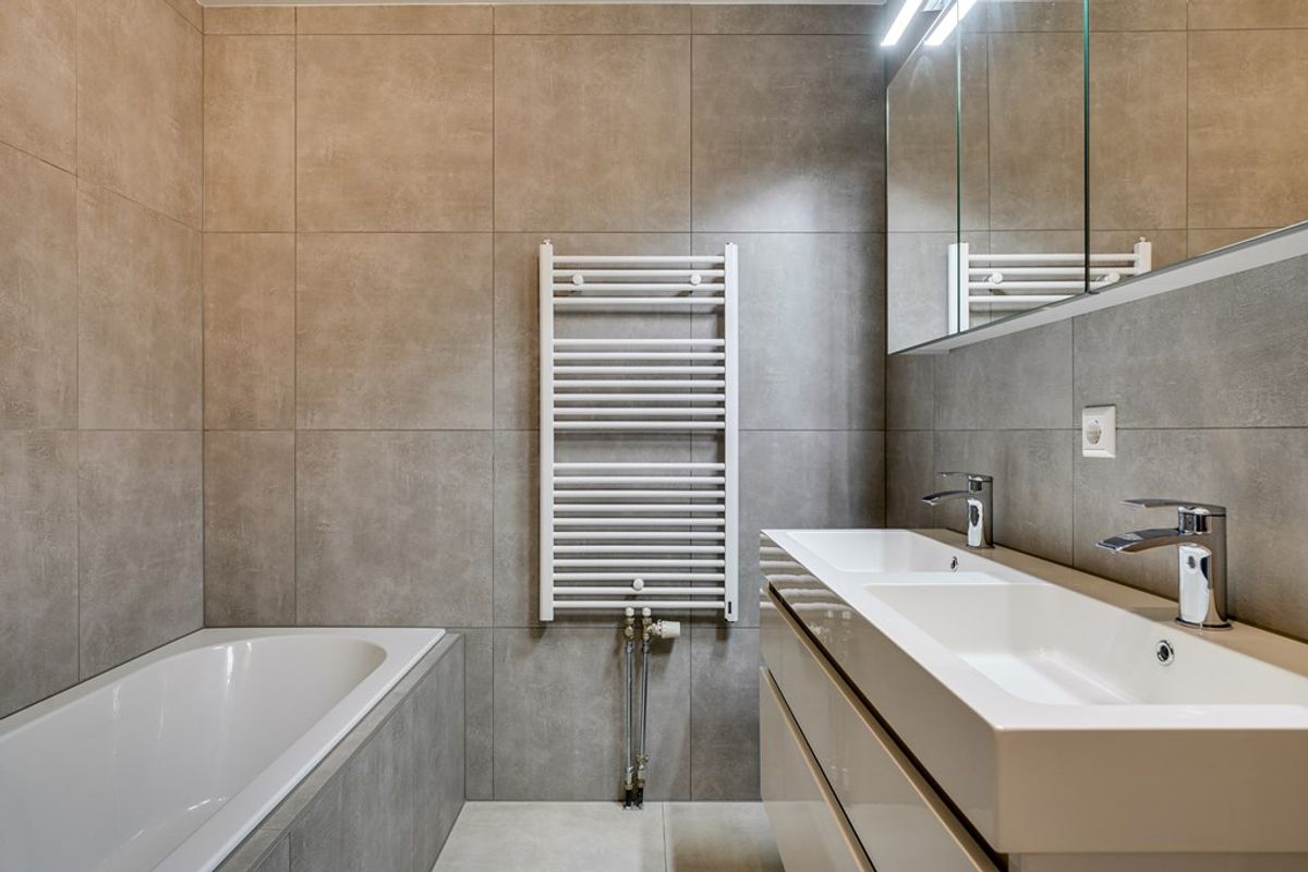 Badkamer: De moderne volledig betegelde luxe badkamer is voorzien van een ruime inloopdouche met thermostaatkraan, ligbad en een dubbele wastafel met lades zorgen voor voldoende opbergruimte.