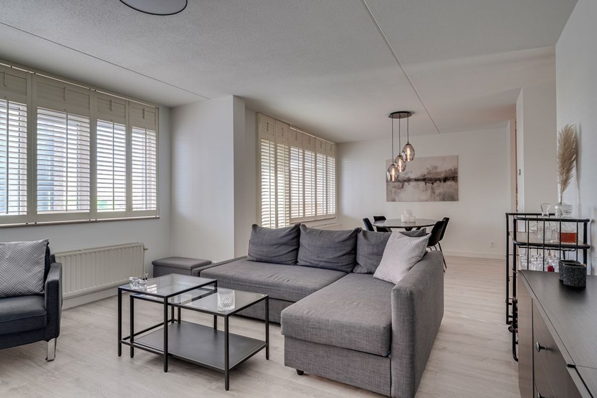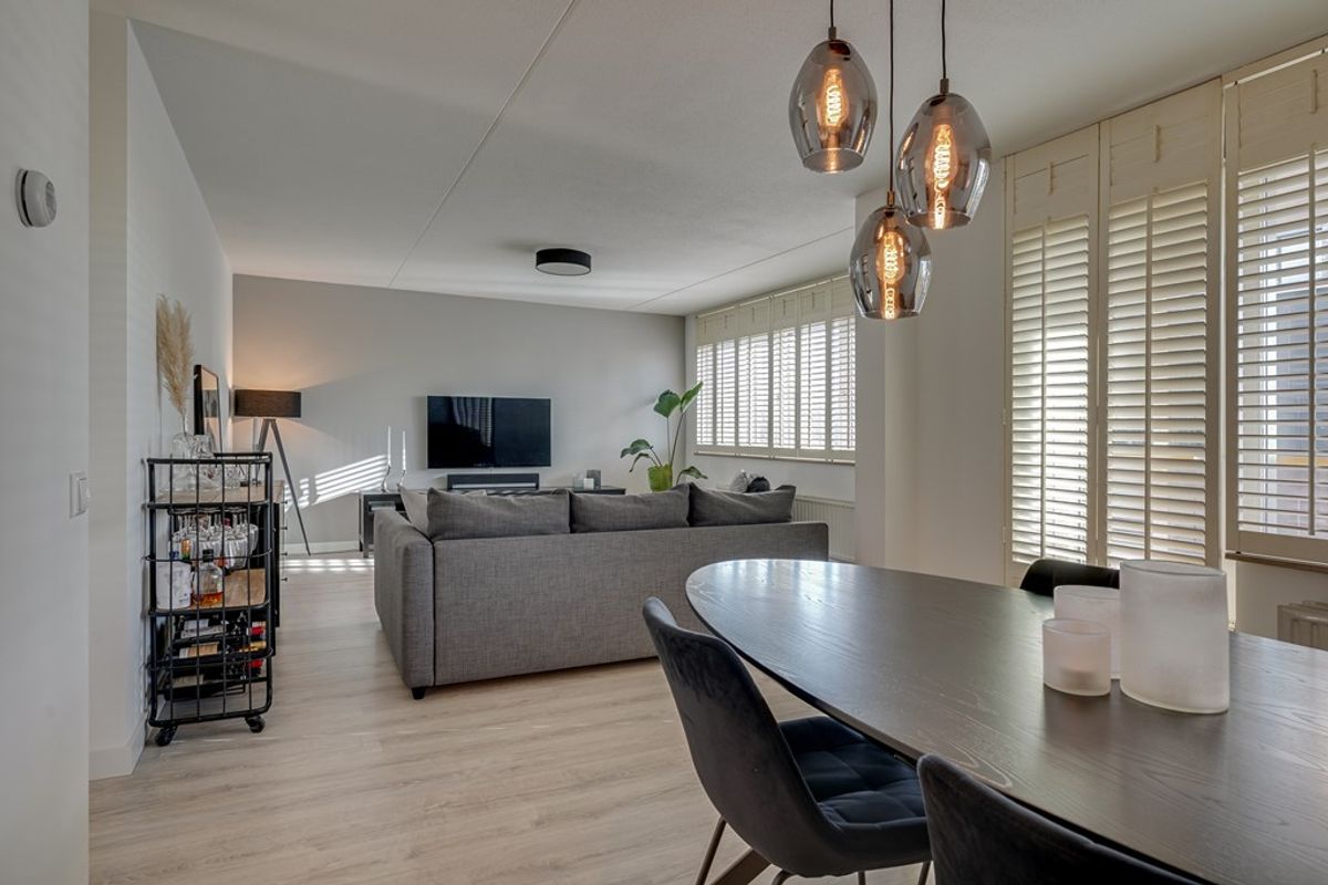 De ruime woonkamer (ca. 34 m²) heeft grote ramen die zorgen voor veel lichtinval en zijn voorzien van stijlvolle shutters. Vanuit de woonkamer is het balkon van ca. 8 m² bereikbaar, gelegen op het noorden, met rookglas panelen en uitzicht op het stationsplein.