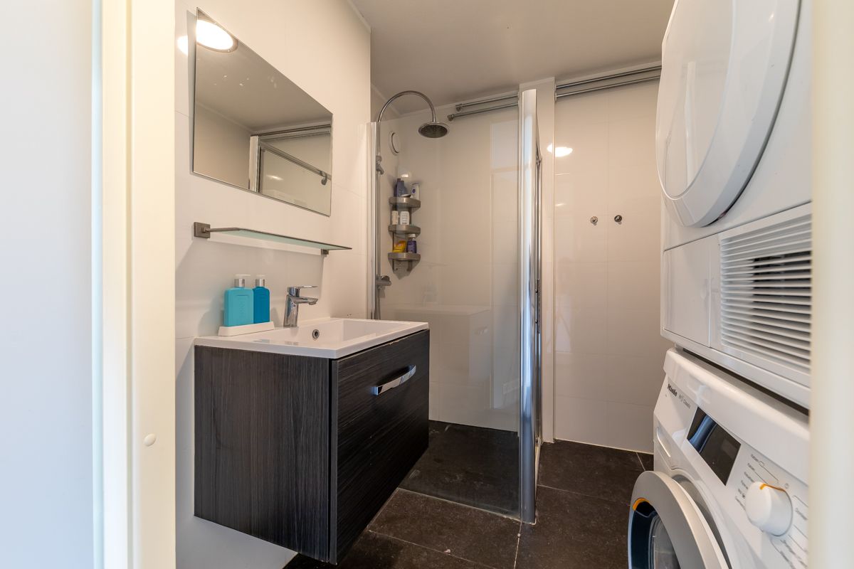 Badkamer met douche en wastafel. Separaat toilet.