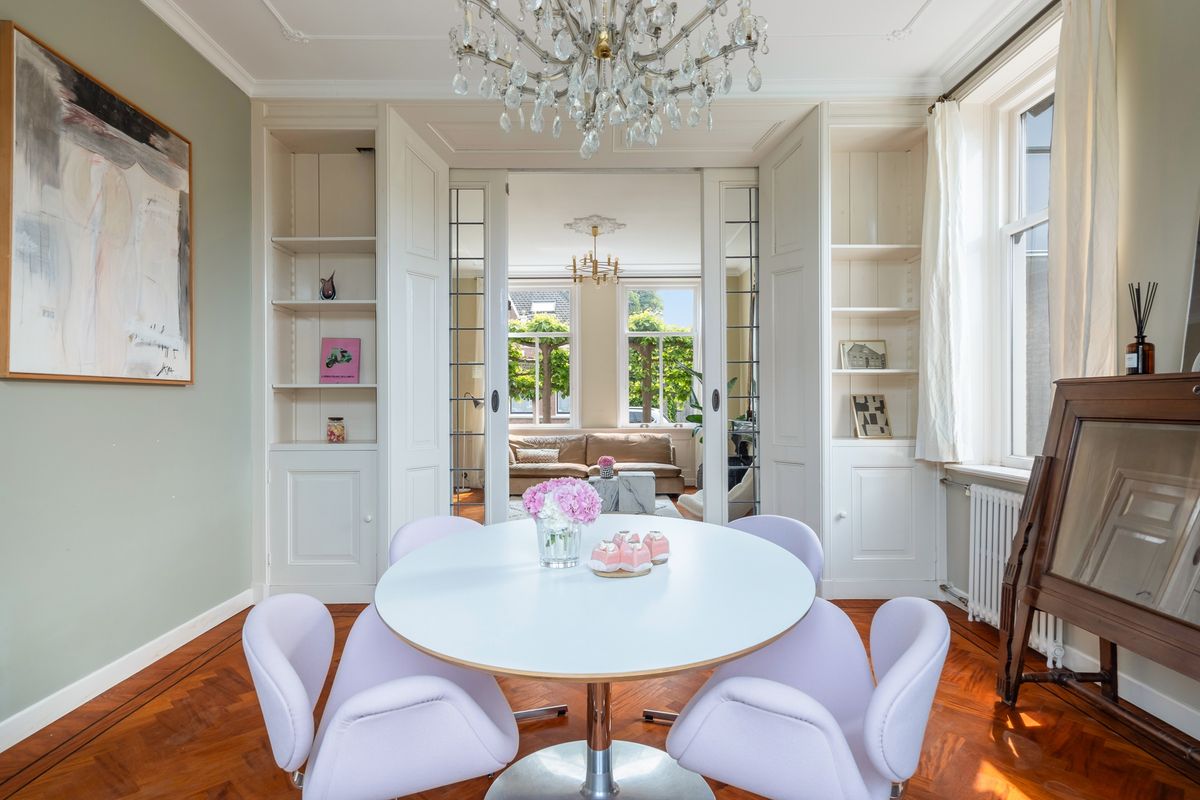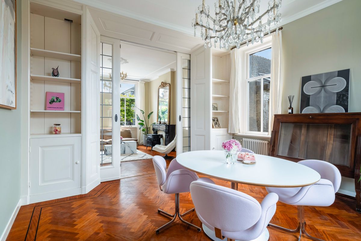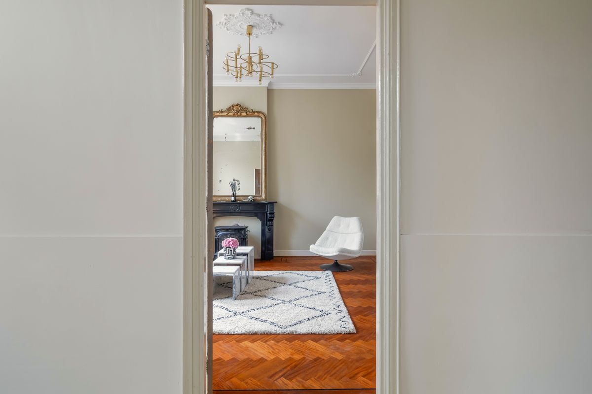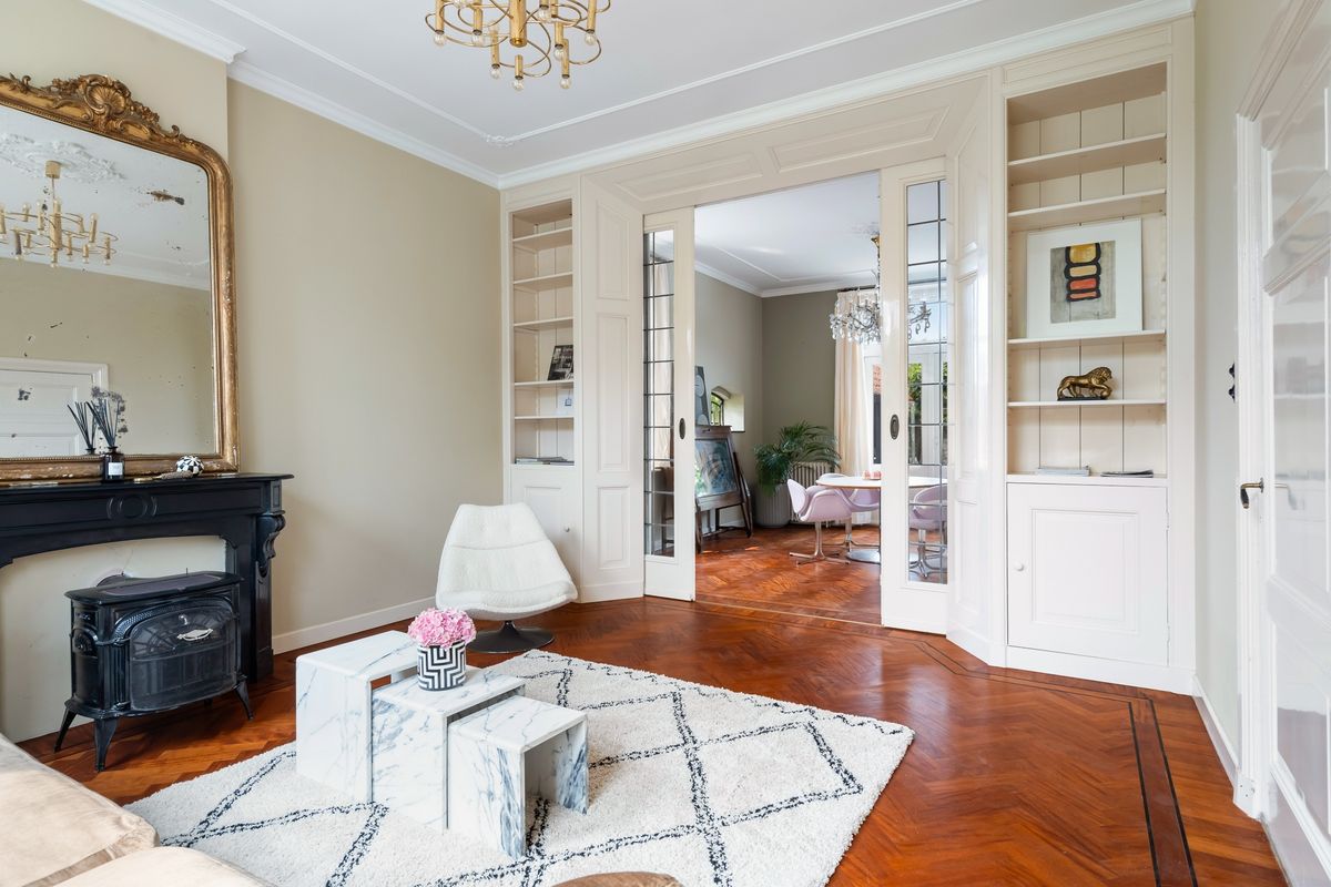 De hoge plafonds en royale schuiframen geven de woonkamer een open en lichte uitstraling. De combinatie met de houten vloer en het ornamentenplafond zorgt voor een stijlvolle en warme leefruimte.