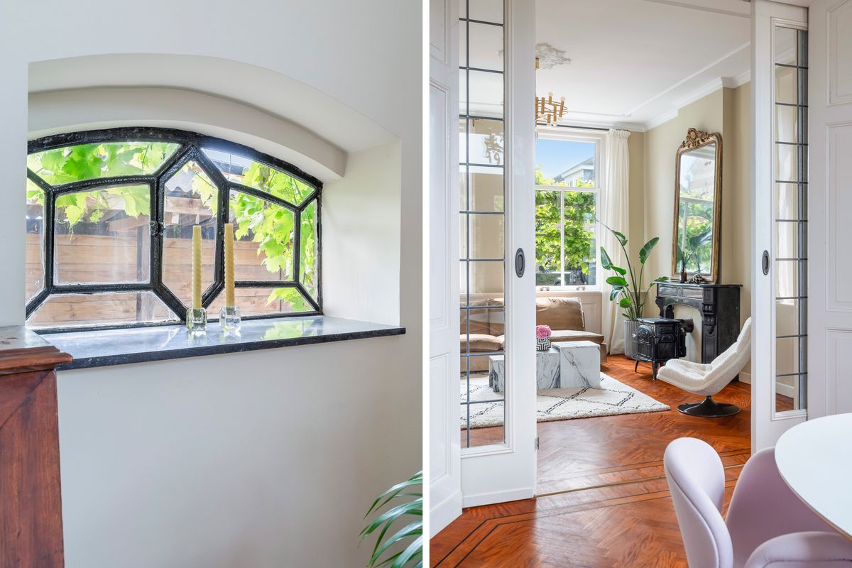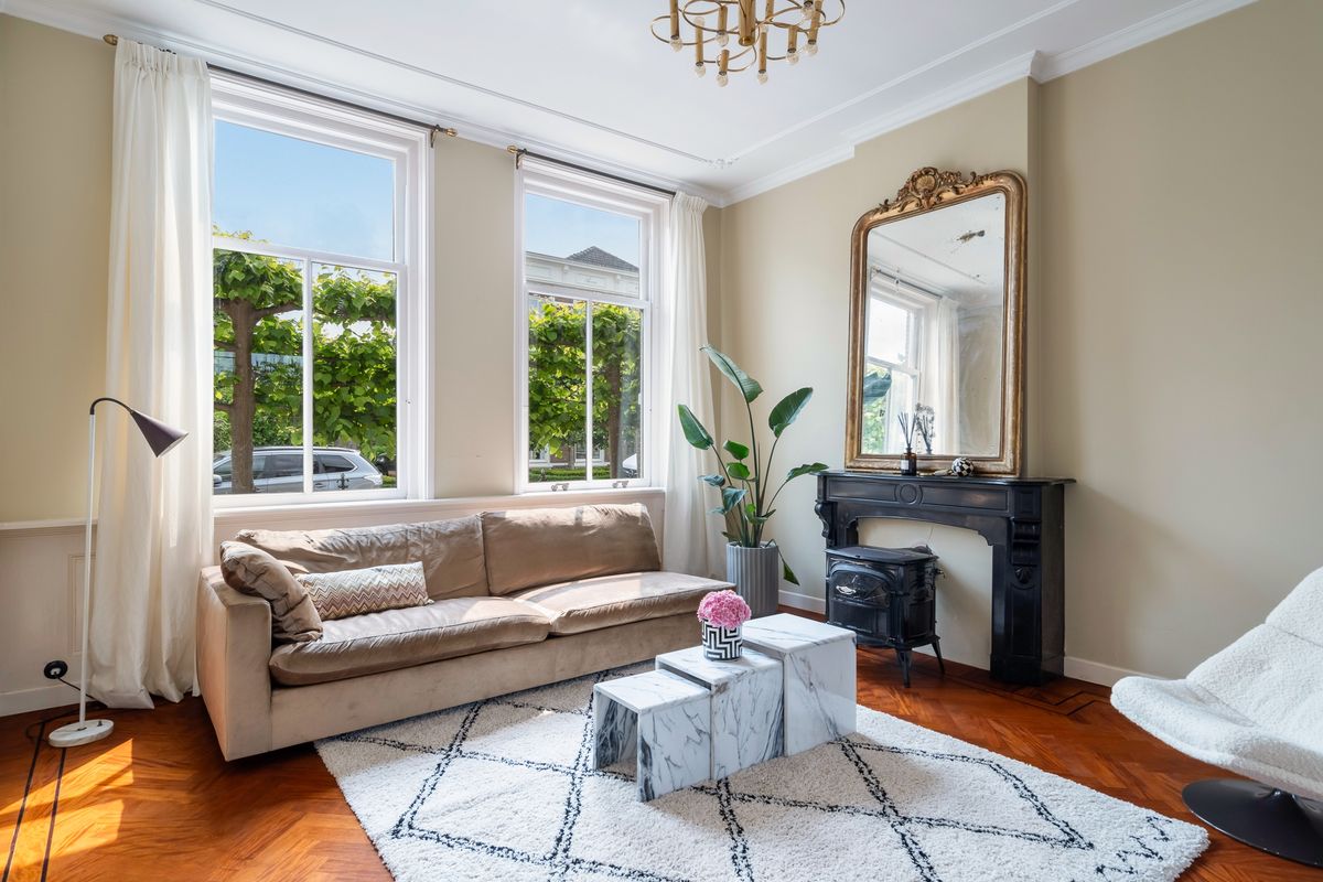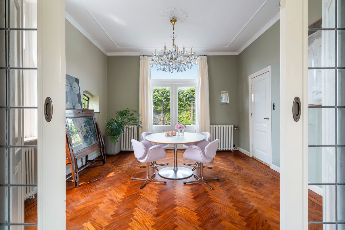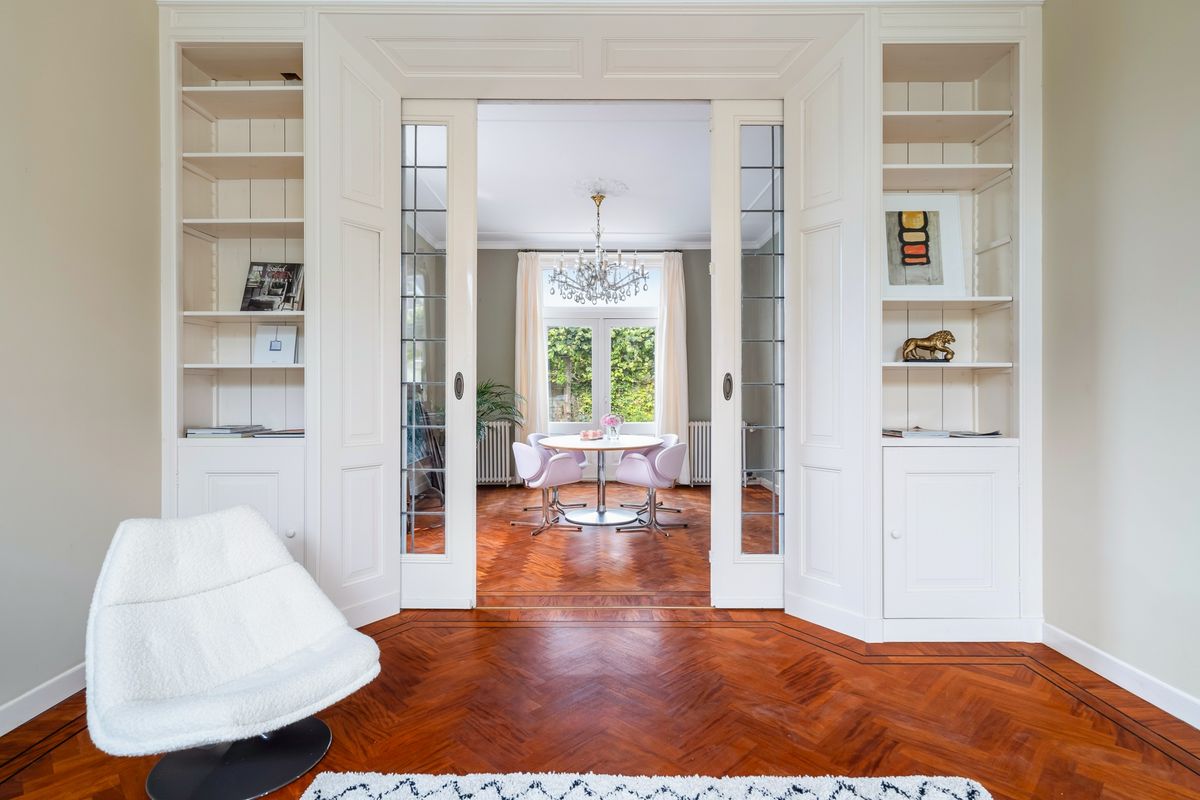 De hoge plafonds en royale schuiframen geven de woonkamer een open en lichte uitstraling. De combinatie met de houten vloer en het ornamentenplafond zorgt voor een stijlvolle en warme leefruimte.