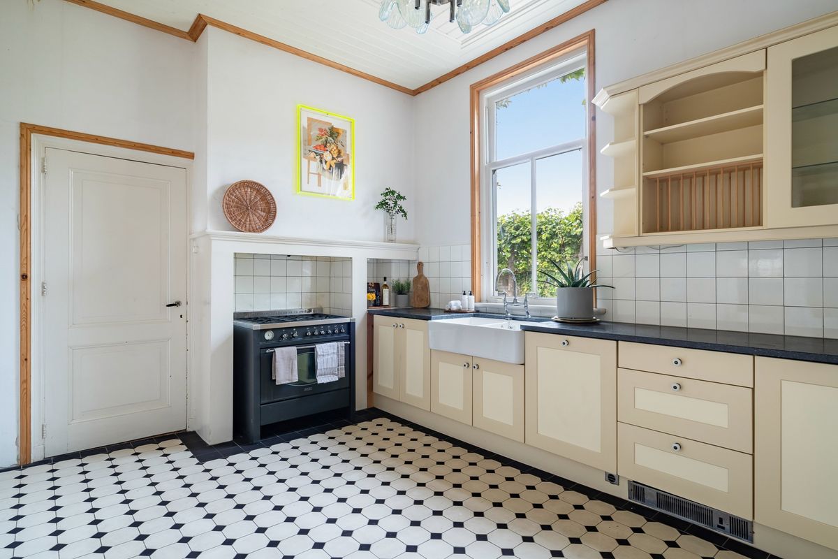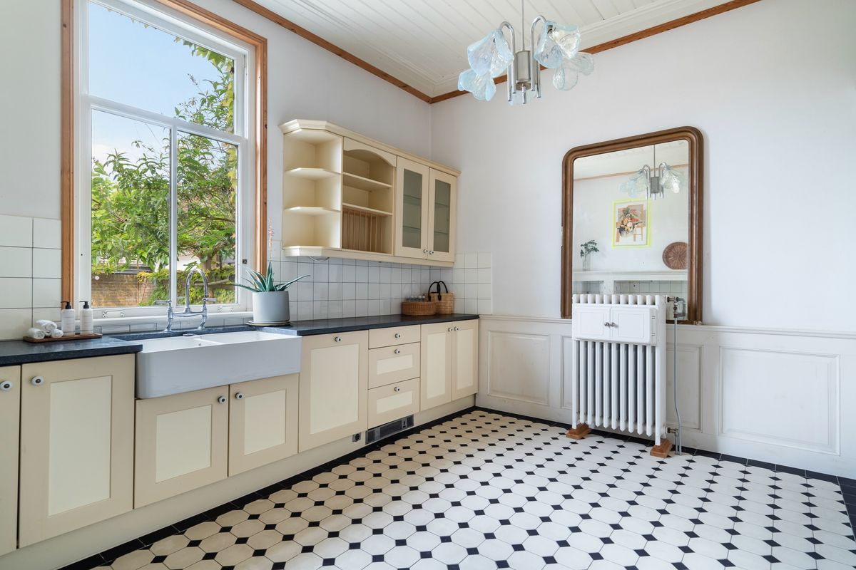 The spacious kitchen, accessible via the hallway with original floor tiles, features authentic details such as Winckelmans floor tiles and classic Dutch “witjes” wall tiles, offering ample room for modern updates tailored to your taste.